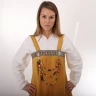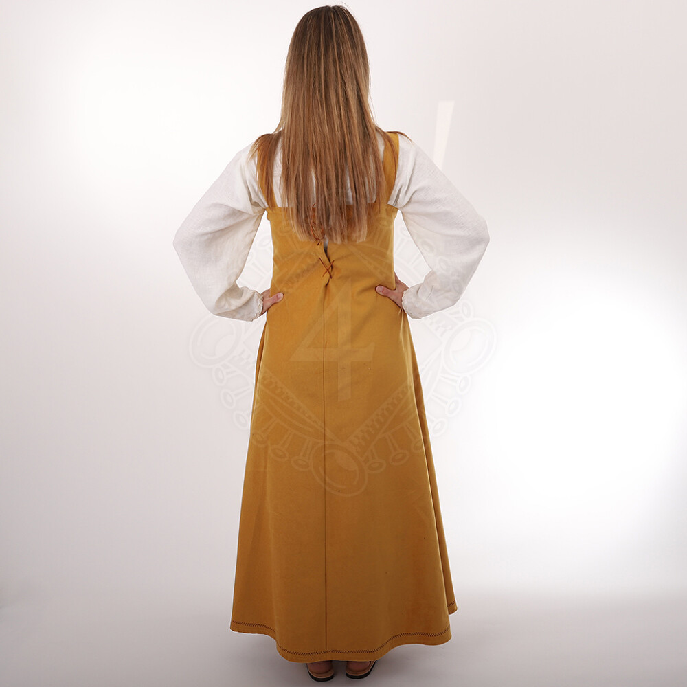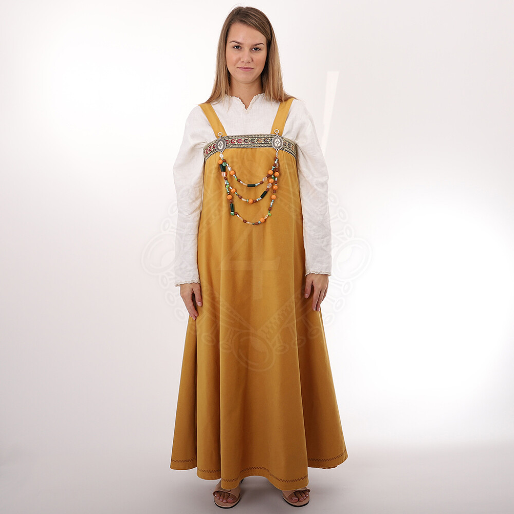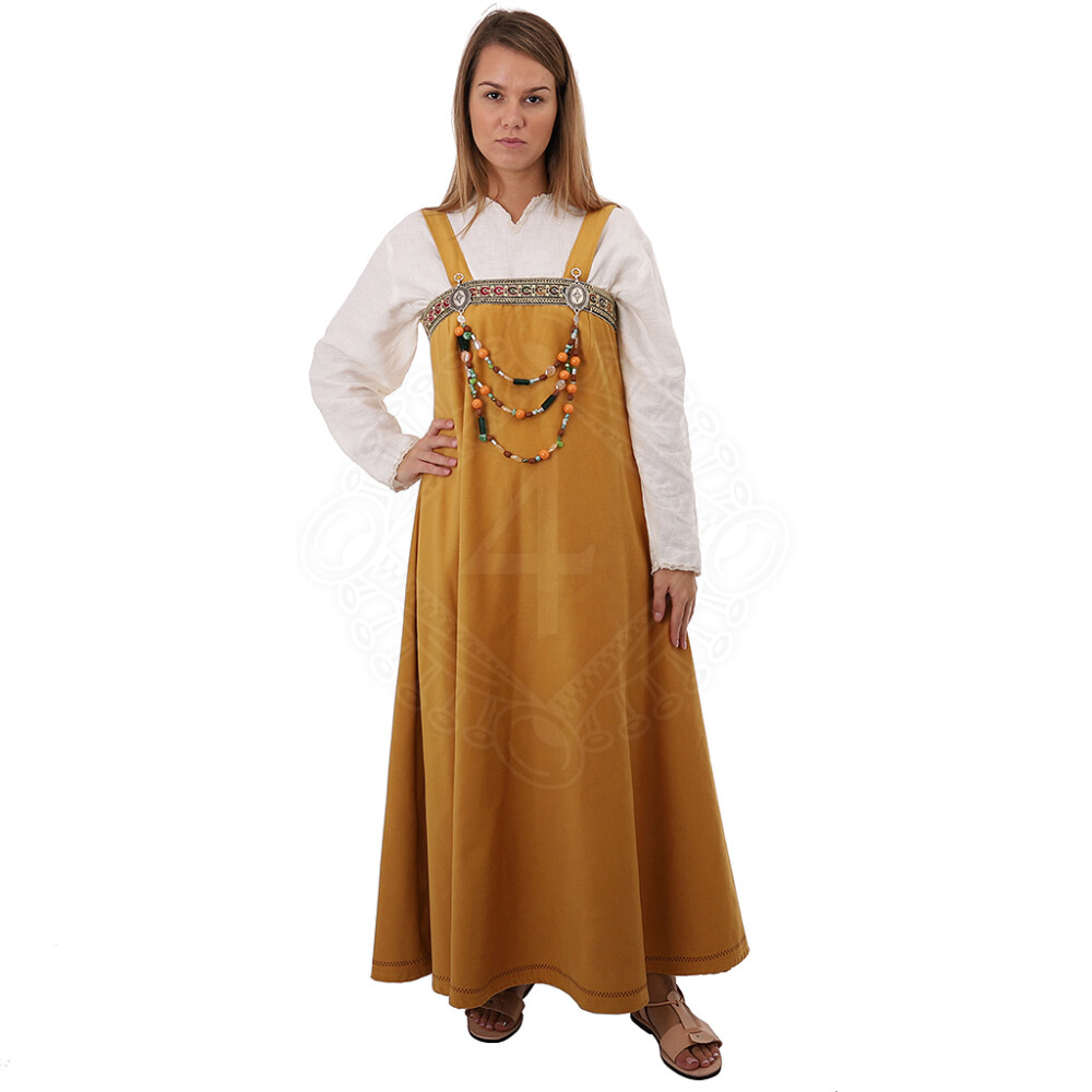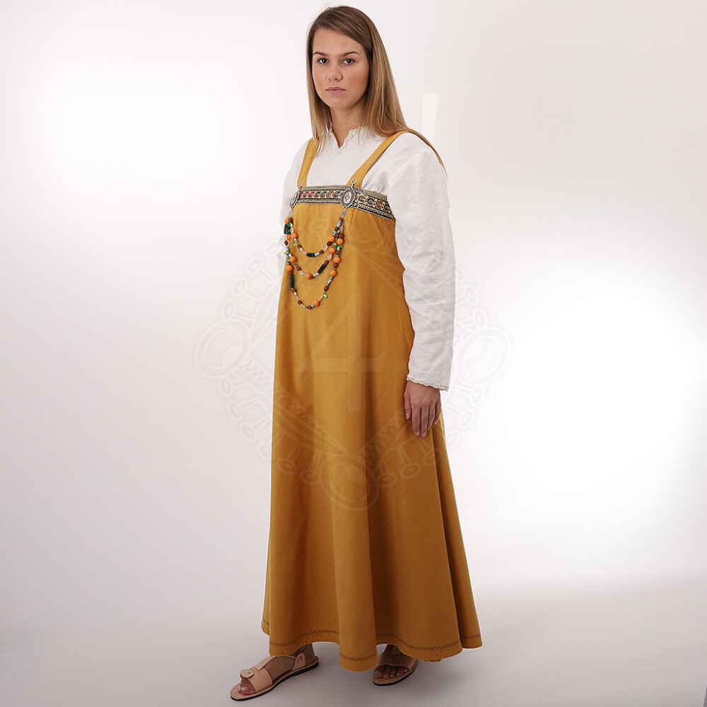 This women's Viking costume consists of a top dress in yellow ocher color, which is decorated with an embroidered hem in the neckline. There is also a clasp made of patinated zinc alloy with beads made of glass and non-ferrous metal. The lower edge of the dress is decorated all around with machine embroidery. Under the dress there is a long Linen shirt with a small slit at the neck. The shirt is decorated with a woven hem of the same color at the lower edge of the sleeves and at the neckline. No shoes are included in delivery. Further product information ...