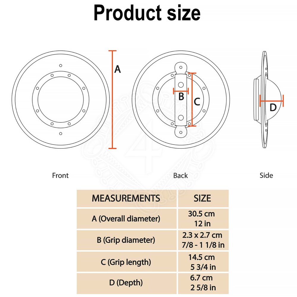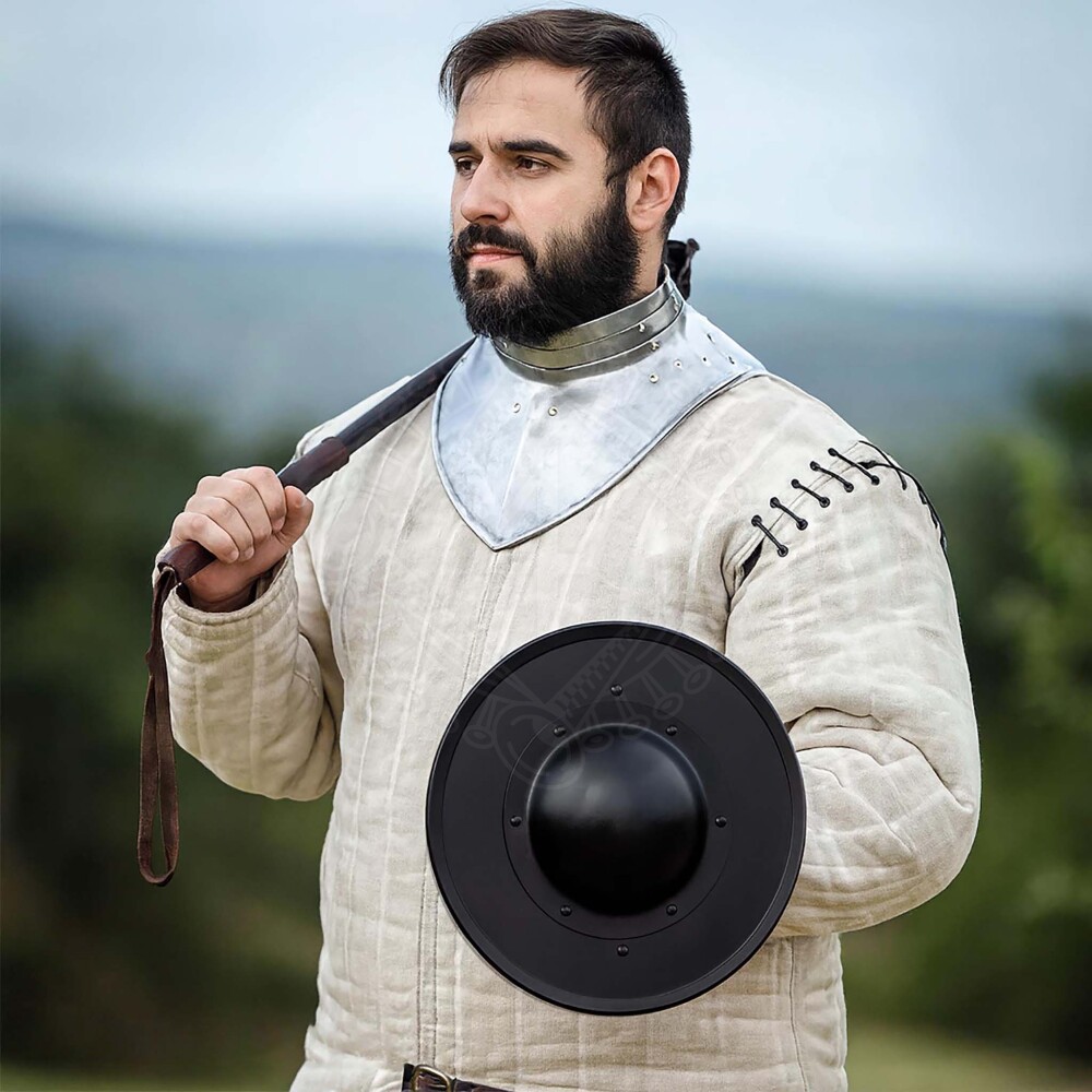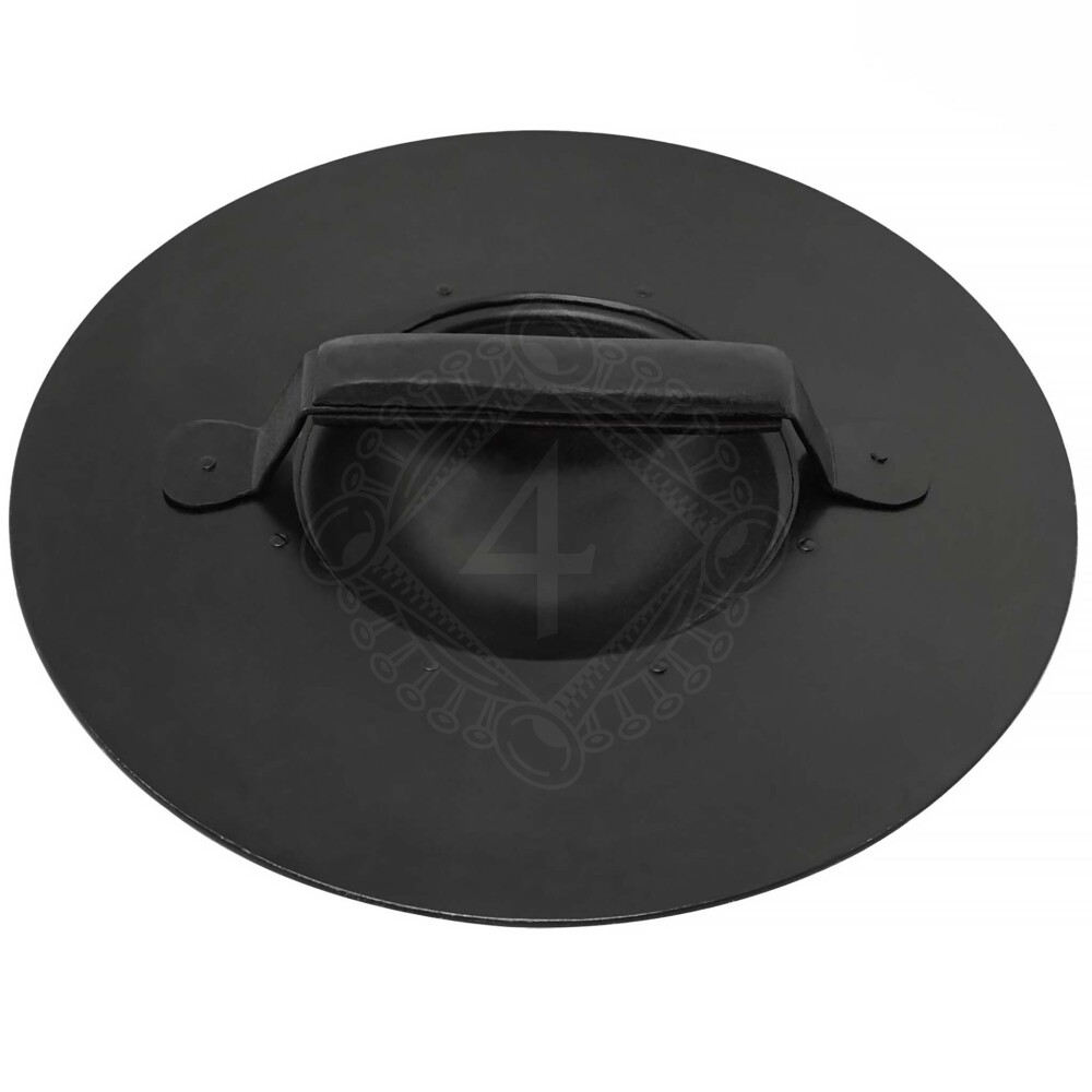 This buckler is based on authentic historical examples used by foot soldiers and duelists between the 14th and 16th centuries. Its construction is driven by maximum functionality. It is made from mild steel approx. 2 mm thick (14 gauge), giving it excellent resistance to deformation from strikes. The centre of the shield features a massive domed boss (umbo), which not only protects the knuckles of the shield hand but also serves for offensive actions – punching or deflecting the opponent's blade.