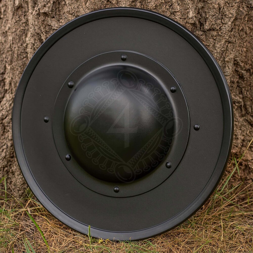 The rim of the shield is slightly flared and reinforced, increasing the structural strength of the entire disc while allowing for effective binding of the opponent's blade. You have a choice of two finishes: polished steel for those who want to shine on the battlefield, or a blackened version for a more subtle, raw look that also resists rust better.