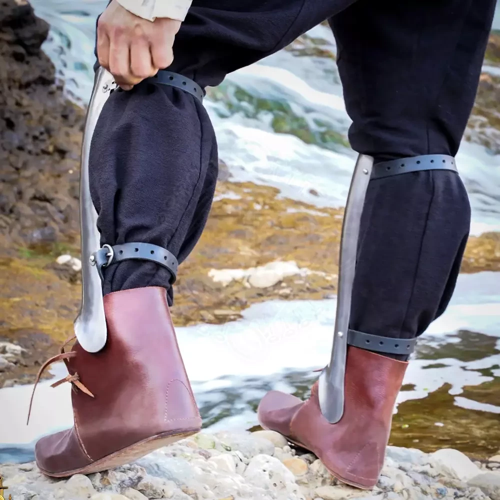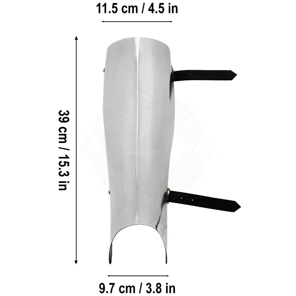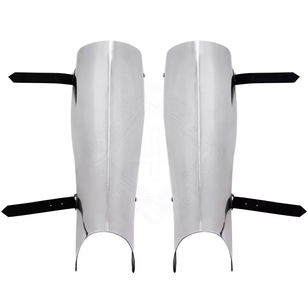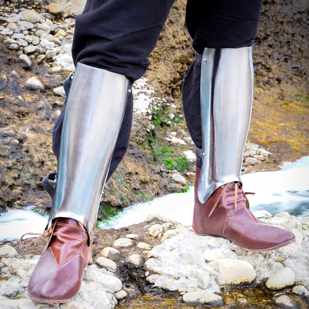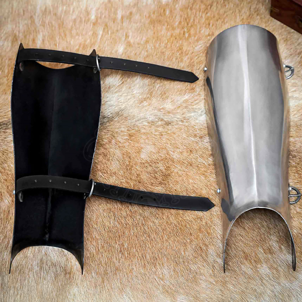 • Secure Fit: Each greave is secured to the leg with two sturdy leather straps and steel buckles, ensuring they stay in place during combat.