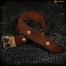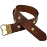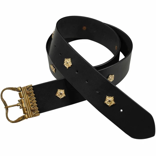 The belt's most striking feature is undoubtedly the ornately decorated cast brass buckle. Its intricate design evokes late Gothic artistry. Along its entire length, the belt is studded with brass rivets in the shape of a five-petaled rose, giving it a regal and distinctive appearance.