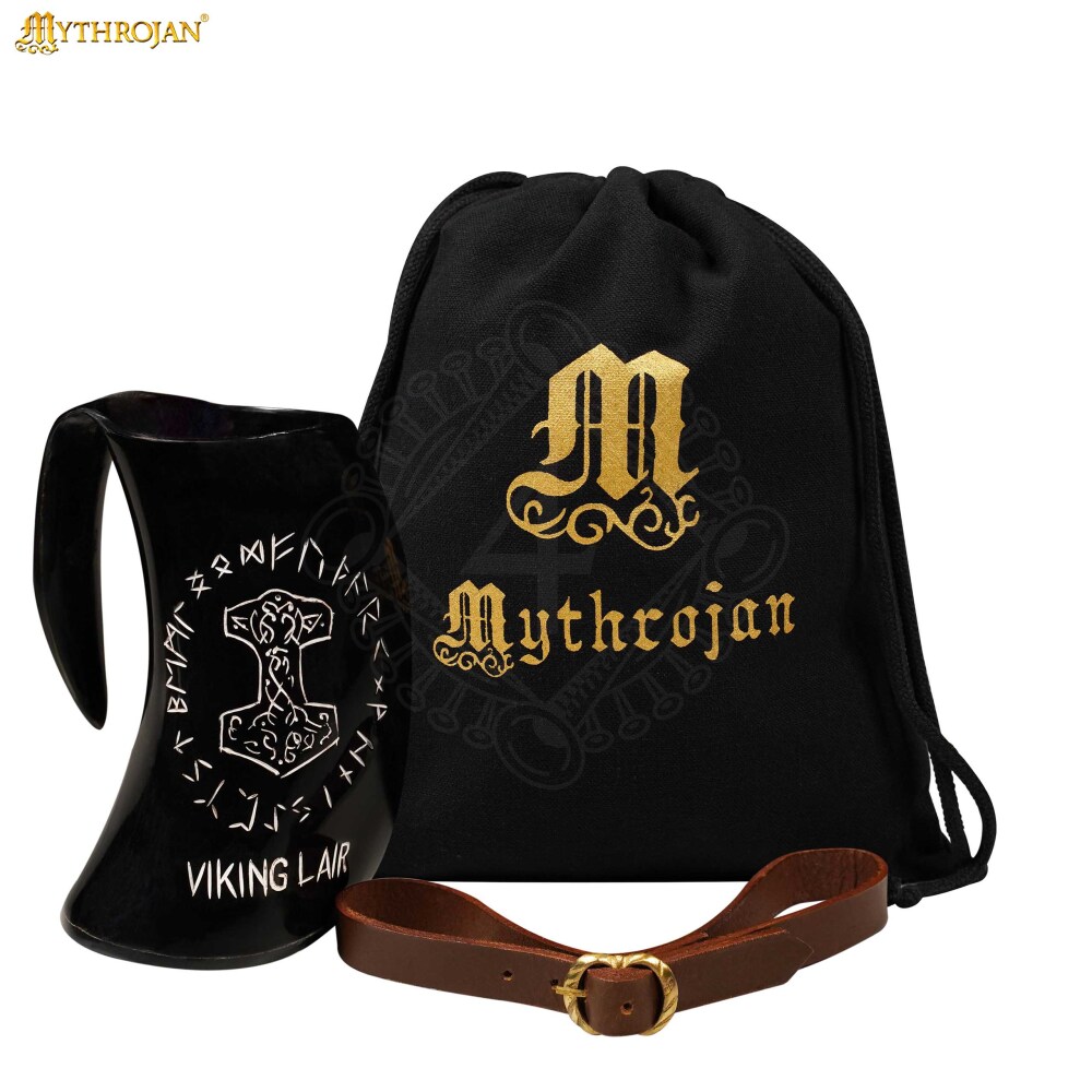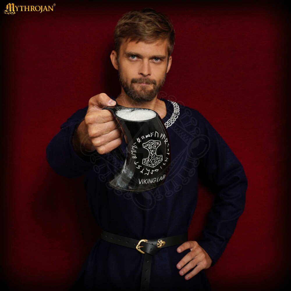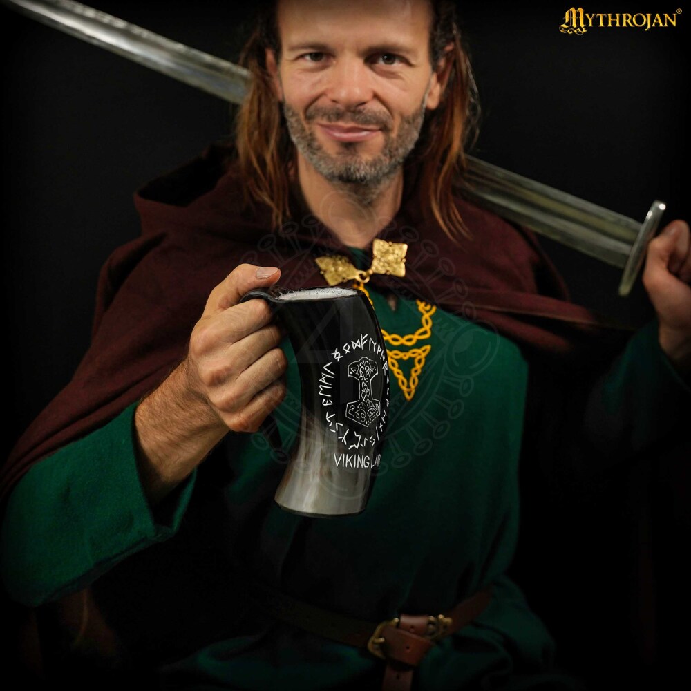 Raise this mighty tankard, crafted from genuine horn, and toast with the power of the God of Thunder! Its dominant feature is the detailed engraving of Thor's Hammer, Mjölnir, surrounded by a protective circle of runes that symbolises strength, protection, and courage. This premium tankard by Mythrojan is handcrafted from ethically sourced natural horn, making each piece an absolute original with a unique shape and colour. The inner surface is treated with a food-safe resin to ensure your drink will not leak. This is not just a drinking vessel – it is a piece of Viking heritage and a symbol of your inner strength. Further product information ...