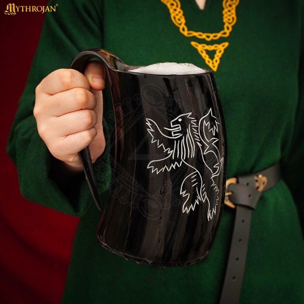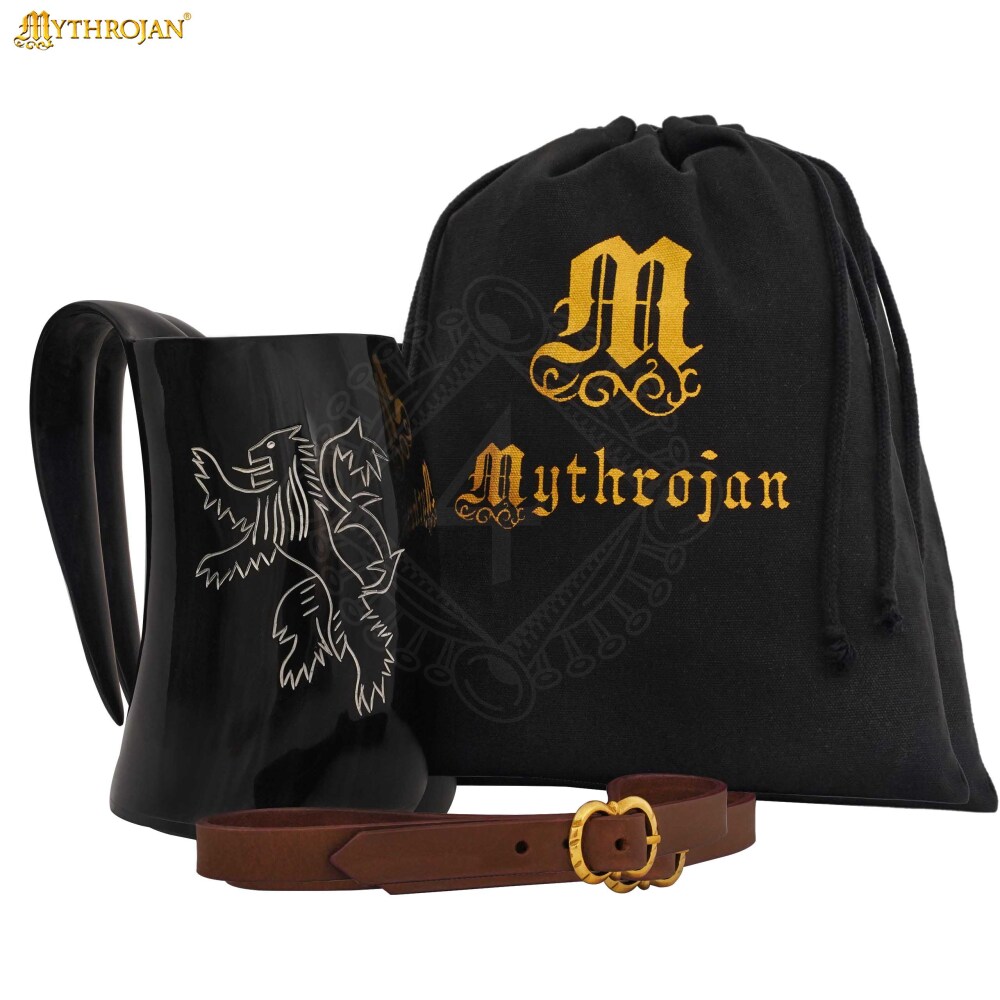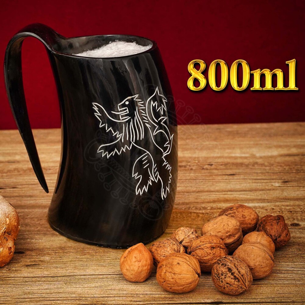 Step into the world of ancient warriors and legends with this massive tankard crafted from genuine horn. With a generous 800ml (approx. 27 oz) capacity, it will quench the thirst of even the mightiest warrior after a victorious battle. Each piece is a unique, handcrafted original, featuring a detailed engraving of a lion—the ultimate symbol of strength and courage. Thanks to the high-quality craftsmanship of the Mythrojan® brand and a food-safe interior sealant, this tankard is not just a stylish accessory but a fully functional vessel for your favourite cold drinks. It also includes a practical leather strap, allowing you to hang the tankard from your belt and keep it always at hand. Further product information ...