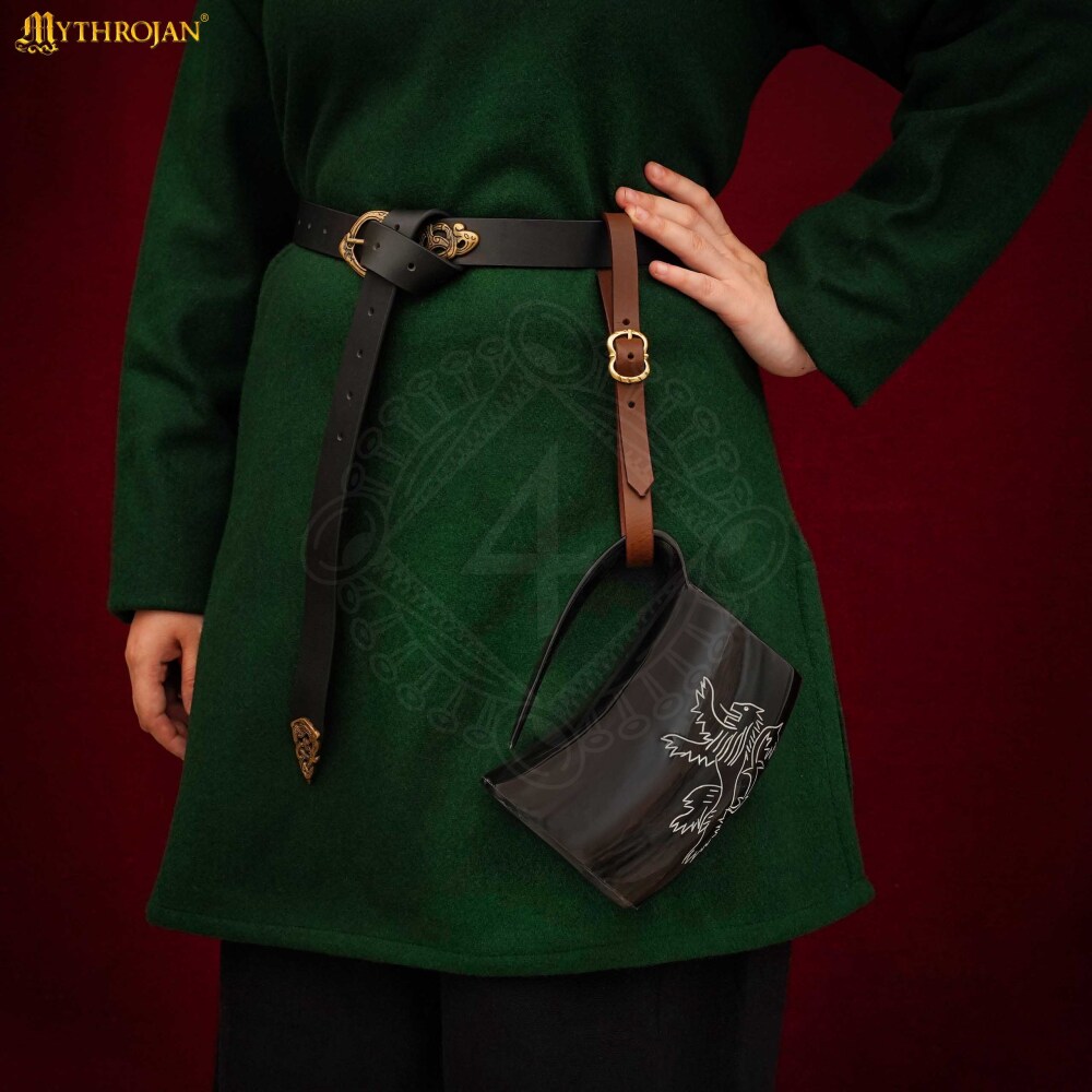 This horn tankard is more than just a drinking vessel; it's a gateway to history. It is perfect for historical festivals, LARP events, gatherings with friends around a campfire, or as a unique centrepiece in your home collection. Thanks to the practical leather belt frog with its brass buckle, you can carry it with you at all times without it getting in your way. Fill it with ale, mead, wine, or any other cold beverage and make a toast in true Viking style. It's the ideal accessory for anyone who admires Norse culture, the Middle Ages, or simply appreciates unique and stylish gear.