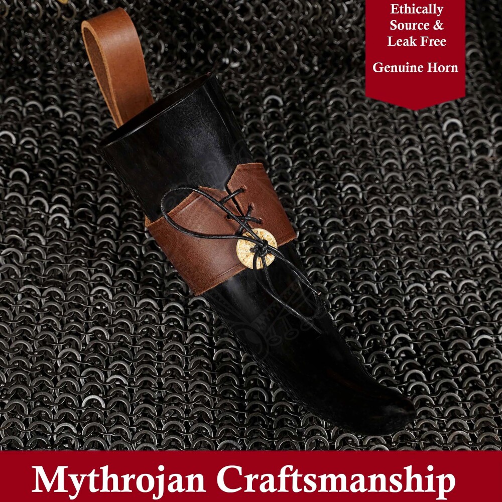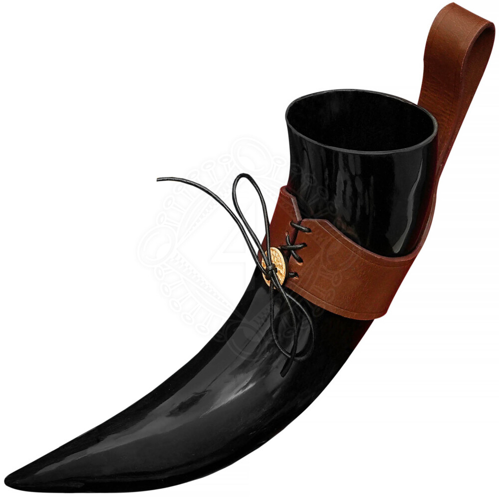 - Practical Leather Holder: Included with the horn is a stylish holder made from real, brown leather (as seen in the photo, detailed with lacing and a metal accent). Thanks to the integrated loop, you can easily slide it onto your belt. No more juggling your horn when you're not drinking – your hands are free, and your horn is kept securely and stylishly at your side!