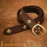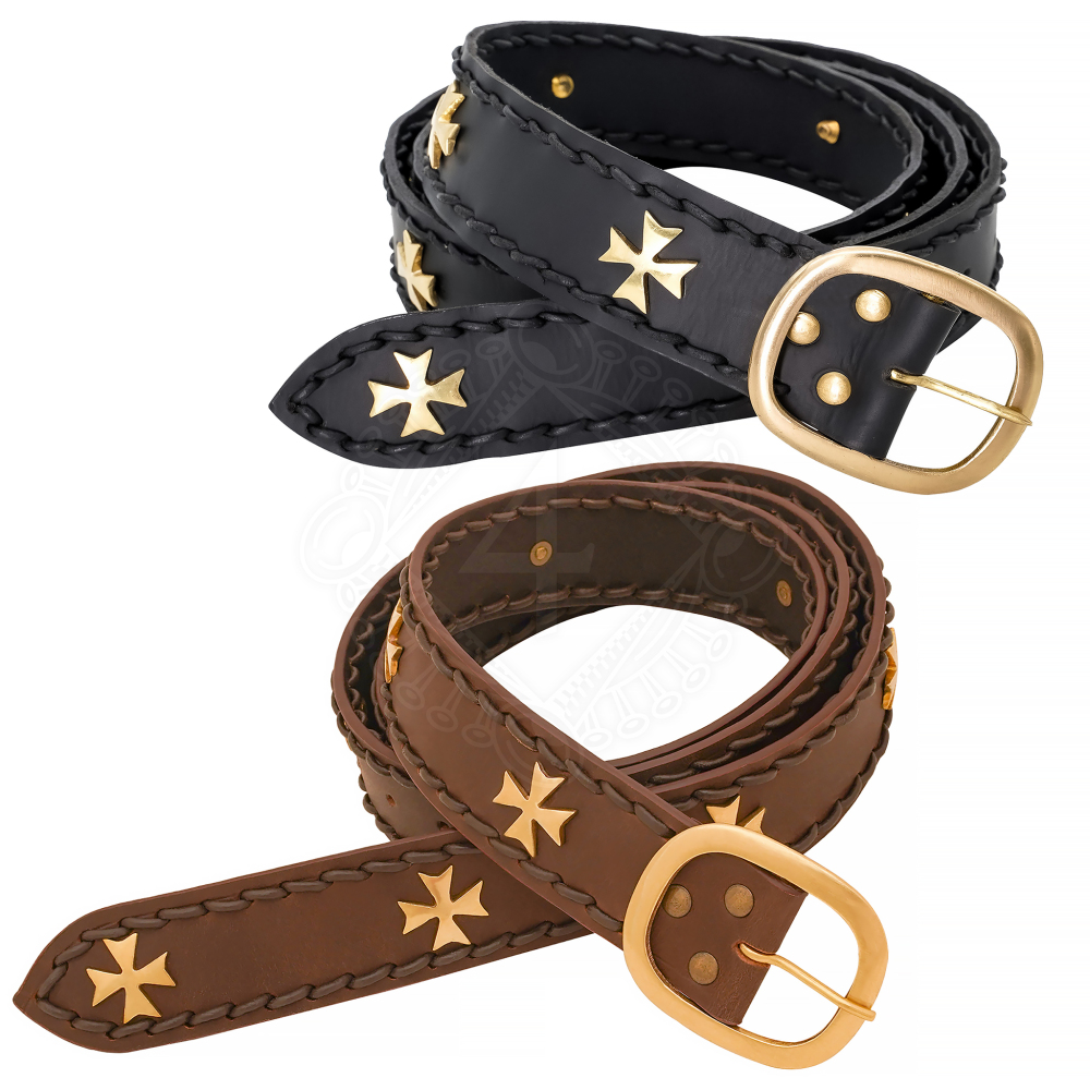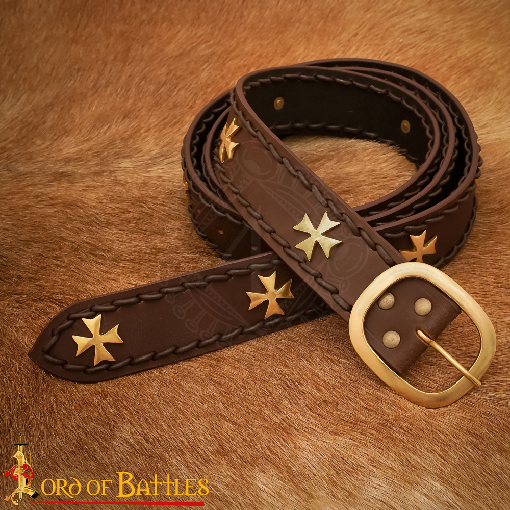 Medieval Crusader Leather Belt with Brass Crosses and Braided Edges