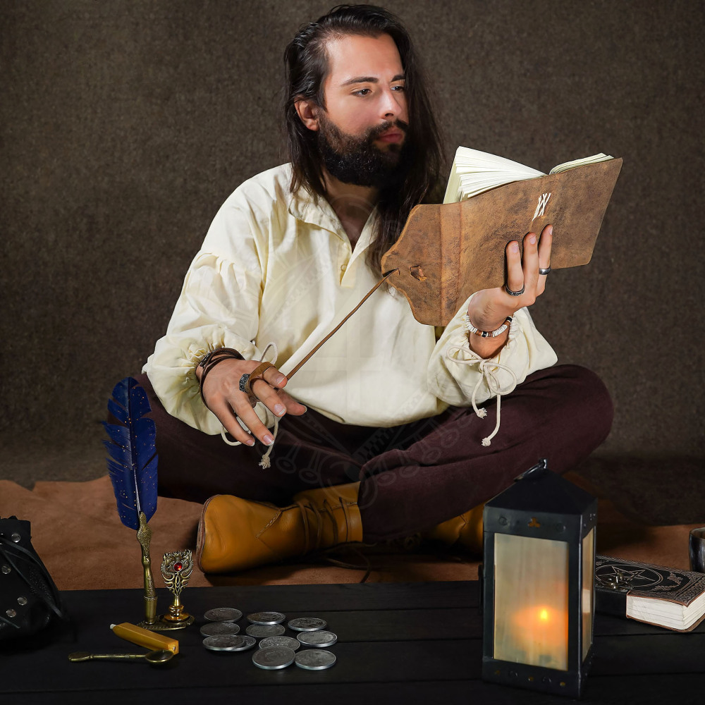 Whether you're at a LARP writing down spells and potion recipes, or at a historical event keeping a camp chronicle, this journal is perfect. It's a fantastic accessory for a mage, ranger, merchant, chronicler, or alchemist character. You can use it as your personal diary, sketchbook, herbarium, or book of shadows. Thanks to its compact size (approx. 6 x 4.5 inches), it fits comfortably in your bag, satchel, or behind your belt.
