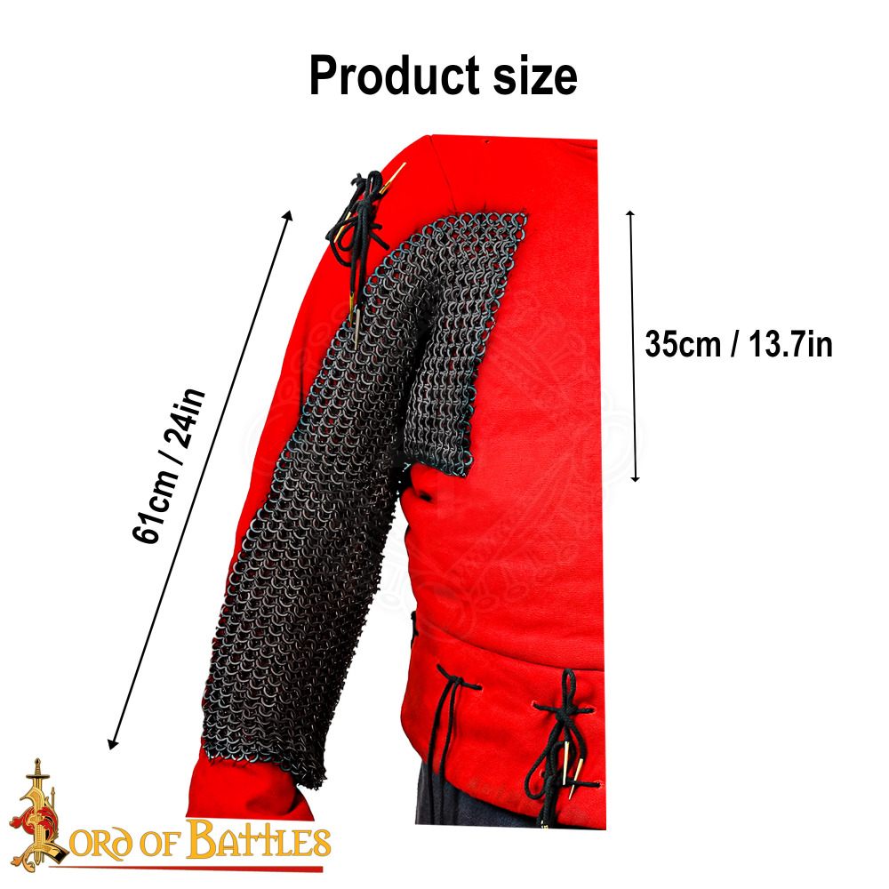 Enhance your protection and mobility on the battlefield with these precisely handcrafted, blackened chainmail arm and underarm protectors! They are crafted from durable flat steel rings (inner diameter 9 mm, 17 gauge wire), where rows of solid, punched rings masterfully alternate with rows of rings meticulously fastened with hollow rivets. Perfectly designed to be worn under your plate armour, they protect key areas of the arms and underarms without the unnecessary weight of a full chainmail shirt. Further product information ...