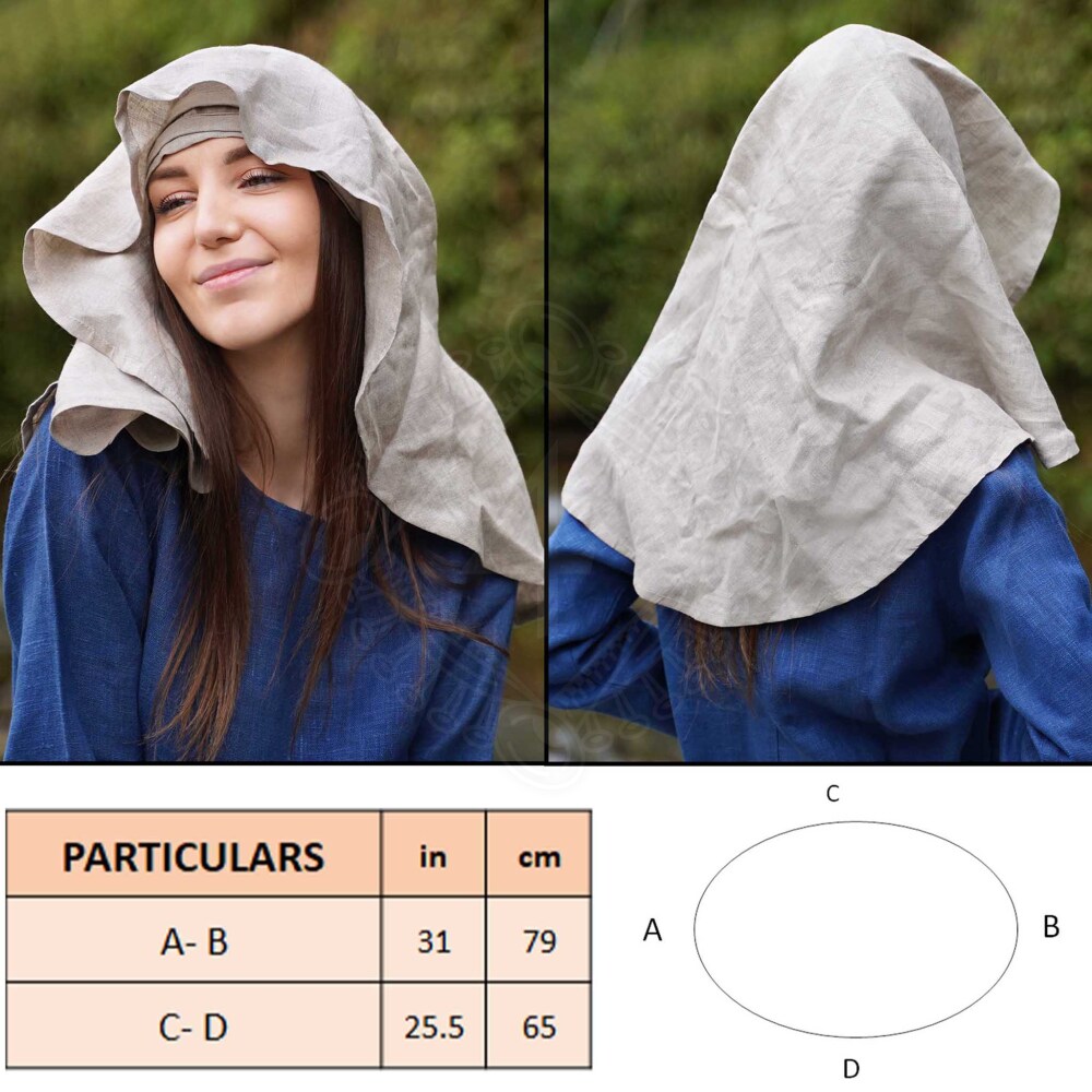 Unlike rectangular scarves, the oval cut offers a much more elegant drape without sharp corners sticking out at the sides. This shape was popular across centuries (from the 11th to the 15th century) for its versatility: