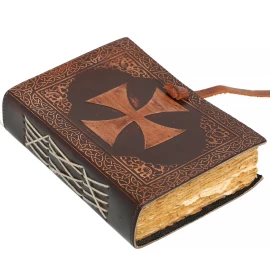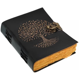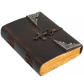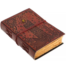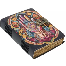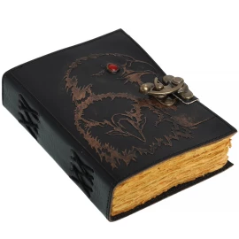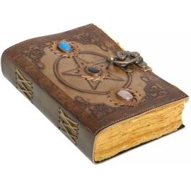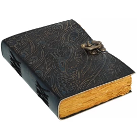 Entrust your greatest secrets, most powerful spells, or deepest thoughts to a book that is a treasure in itself! This stunning journal is hand-bound in genuine buffalo leather, and its covers are a work of art. They are adorned with intricate relief embossing featuring floral and geometric motifs, dominated by a central mandala. In its centre, a large, polished blue stone is set, giving the journal an aura of mystery and magic. Your writings are kept securely locked by a stylish brass latch. Inside, 110 sheets (220 pages) of handmade, unlined paper await you. Ideal as a book of spells, a personal diary, a sketchbook, or a luxurious gift. Further product information ...