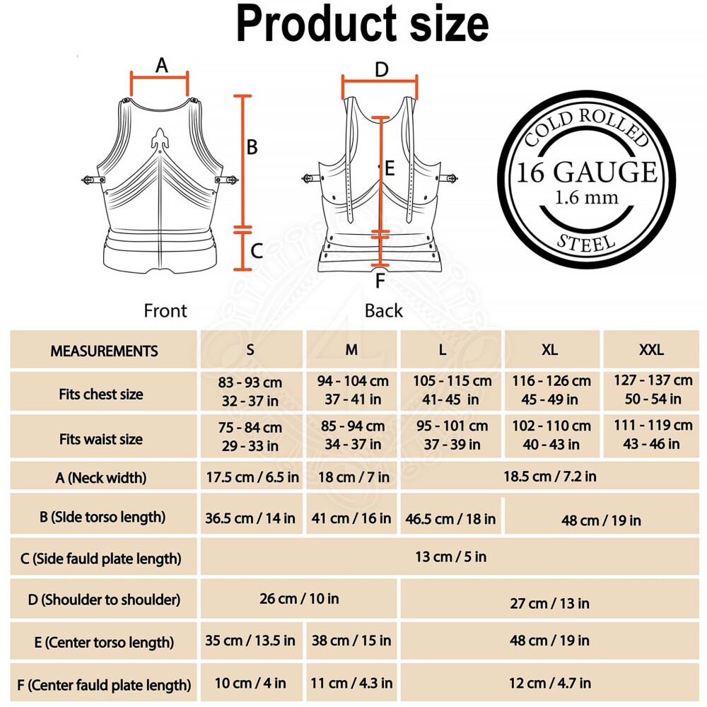 To select the correct size, please carefully measure your chest and waist circumference over the gambeson or other garment you will wear underneath the cuirass.