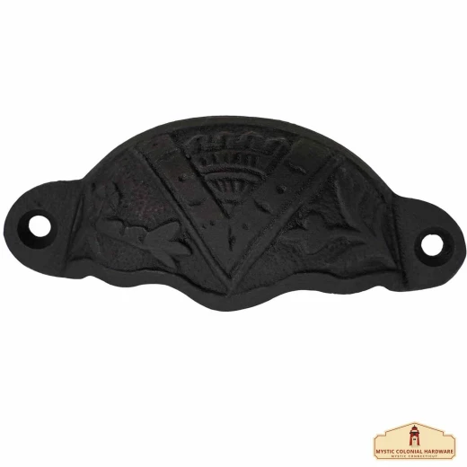 Lend your furniture a touch of historical sophistication with this ornate cup pull. It is crafted from solid cast iron, and its design combines rustic charm with colonial elegance. The centerpiece of the pull is a V-shaped motif beneath a royal crown, flanked by floral accents. The traditional oil-blackened finish not only highlights these intricate details but also ensures high durability and a long life. Further product information ...