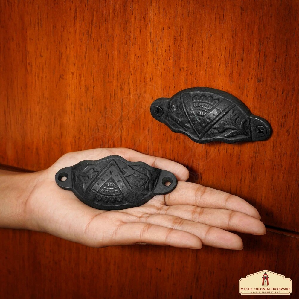 Cup or shell pulls became exceptionally popular in the late 17th and throughout the 18th century. They were originally used frequently on apothecary chests and library card catalogs because their cupped shape made it easy to pull open heavy, often-used drawers. At the same time, they provided the perfect spot for an identifying label.