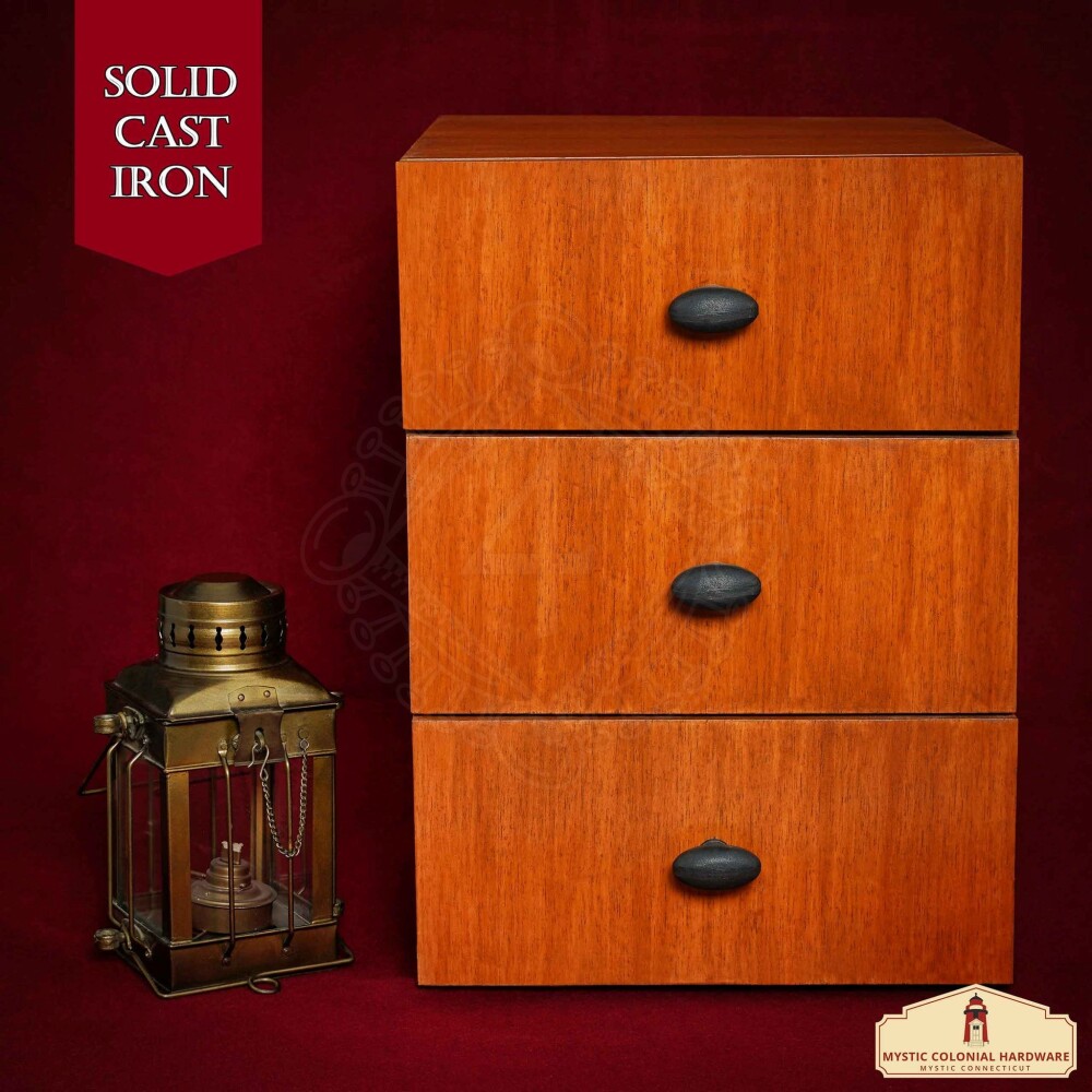 The design of this knob draws inspiration from the American Colonial period (17th and 18th centuries). During that time, furniture hardware was primarily functional and unadorned. Local blacksmiths produced simple and durable iron components that had to withstand harsh conditions. Oval and egg-like shapes were among the most popular because they were practical and easy to produce. This knob is therefore a direct link to an era when durability and honest work were valued above all.