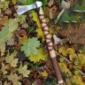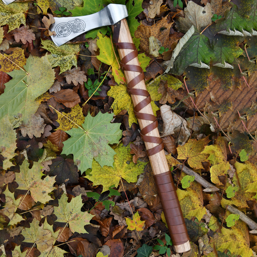 Shapewise, the head of the Viking axe we offer here is classified as a Petersen type A. The blade of this axe is made of EN45 high carbon steel, and engraved with a Norse motif. The handle is made of robust ash wood and wrapped in leather.