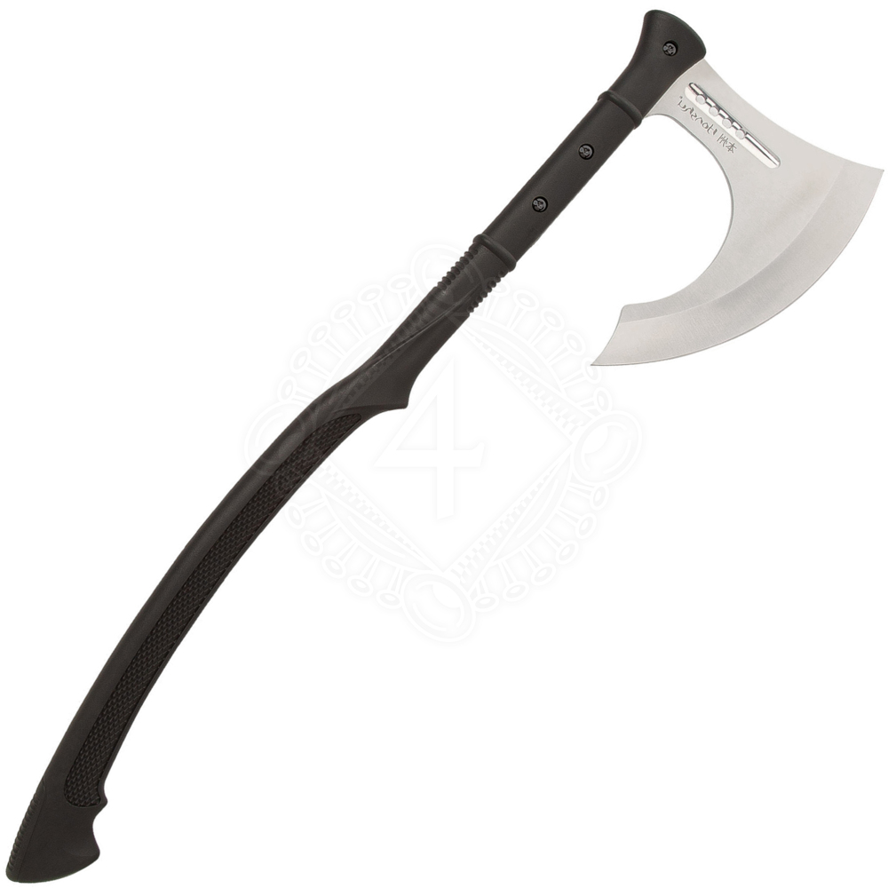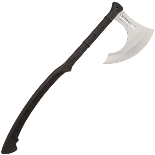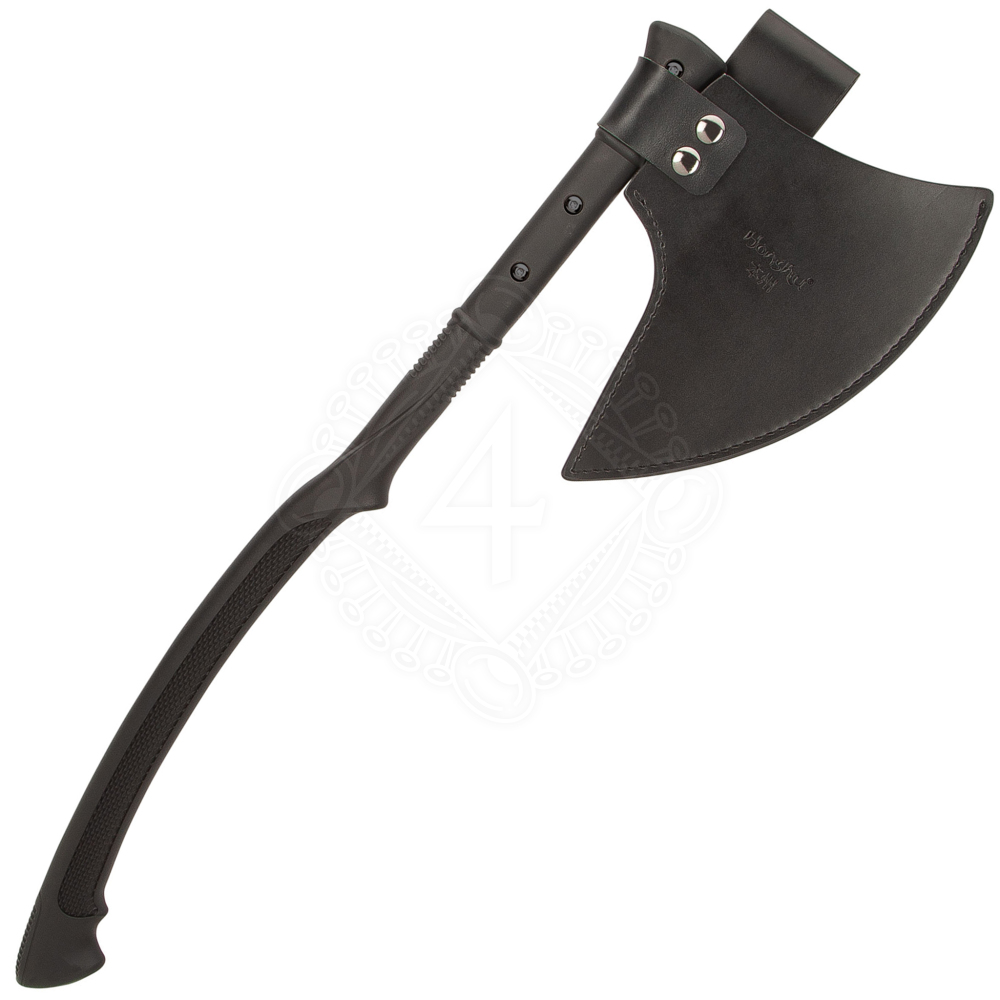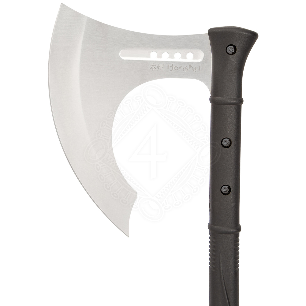Honshu is known for its savage blend of tradition and innovation that forges a style and function in its modern, battle-ready weapons that’s beyond compare. The Karito Battle Axe takes the traditional bearded blade design that was used by Japanese carpenters and elevates it into a formidable battle weapon. The 6” wide, 7Cr13 stainless steel bearded axe head has a hair-shaving sharp, 8 1/2” blade that has a satin finish. The curved handle is crafted of impact-resistant, injection molded nylon and it has a heavily EDM textured grip. The 27” overall battle axe comes with a premium leather cover with heavy-duty belt loop and double-snap closure. Further product information ...