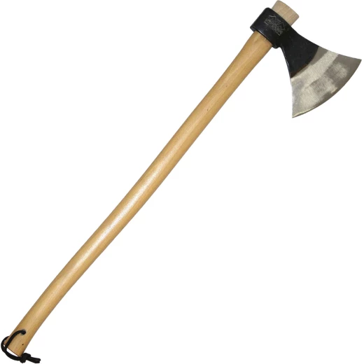 The head of this trentino-type axe is made of C45 carbon steel and has a polished and hardened blade. The handle is made of beech wood and has a leather cord at the end.