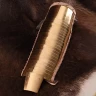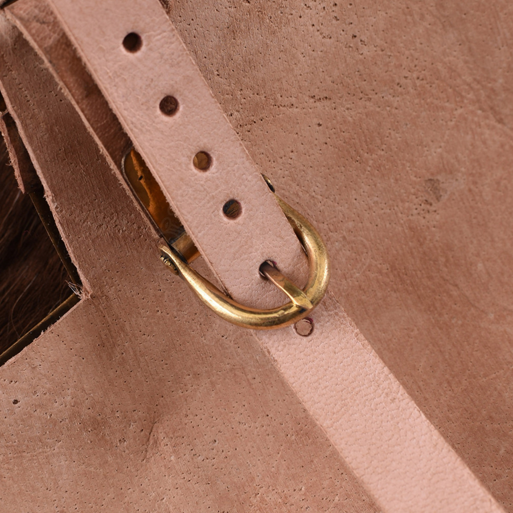 This replica of a manica consists of brass plates that have been riveted together. It has a protective plate for the hand and a leather underside, which is attached to the brass plates with leather cords. The manica is attached to the arm using leather straps and brass buckles.