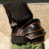 Leather armour for your shoulders (with fitted edges) for the upper part of the body.The leather is pliable so no movement of a warrior during a LARP battle will limit his liberty of actionand the two tone effect increases the beauty of this piece of armour.The shoulder parts are fastened to the neck guard with leather laces and the neck guard itself is closed in the back by a double toggle fastener.The arm parts are buckled to the upper arm. Further product information ...