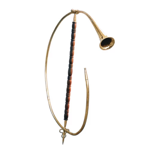 This functional replica is made of brass and equipped with a wooden handle. The horn is delivered unmounted. It is composed of three threaded tubes, a mouthpiece and a crossbar/handle. The final assembly is very easy and needs to be carried out by the customer.