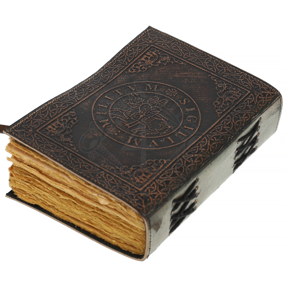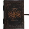 This handcrafted, leather-bound journal notebook exudes antique charm and mystery. The sturdy black boards are decorated with deep embossing that creates an intricate pattern framing the central motif - a distinctive Knights Templar cross on the front and the seal of the Knights Templar on the back. Further product information ...