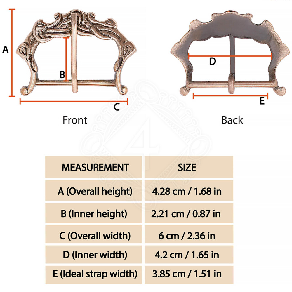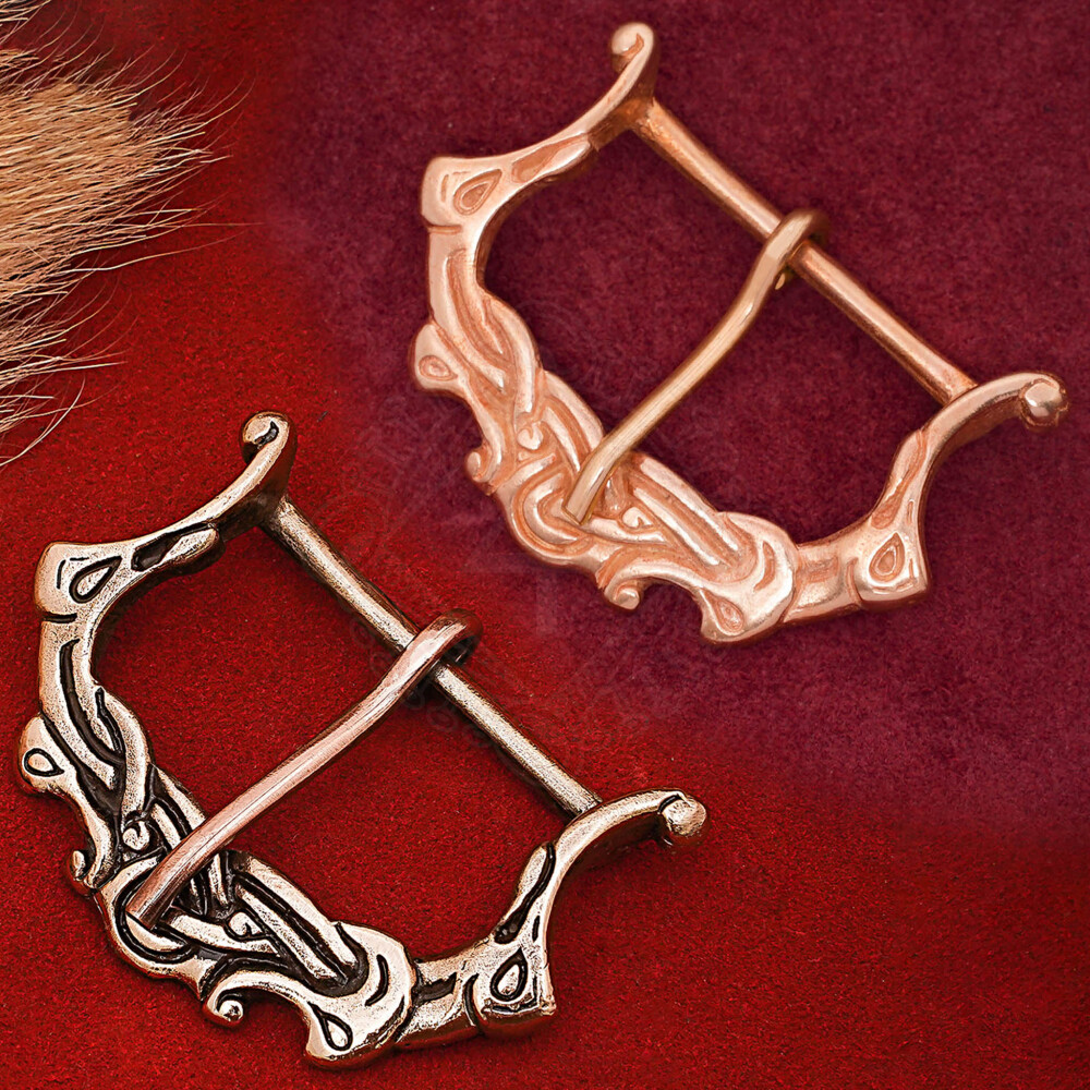 This intricately crafted bronze buckle is inspired by historical finds from the Viking Age, dating from the 9th to the 11th century. Its authentic design and precise craftsmanship make it a perfect addition to your historical attire, whether you're involved in reenactment, LARP, or simply an admirer of Norse art. The buckle is designed to fit belt straps up to 3.85 cm (1.5 inches) wide and is available in two distinct finishes: a brightly polished bronze for a pristine look, or an antiqued version with a deep patina that evokes the feel of a genuine archaeological artefact. Further product information ...