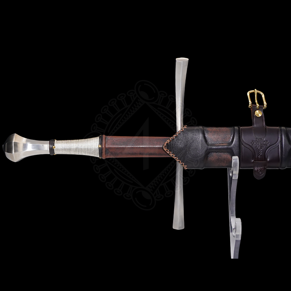 The hilt consists of a wood core covered in leather, featuring a section wrapped in silver-plated wire near the guard, ensuring a secure grip even with sweaty palms or gloves. The faceted scent-stopper pommel helps balance the long blade and allows for quick manipulation. The crossguard is slightly curved towards the blade, a typical feature of swords from the late 15th and early 16th centuries.