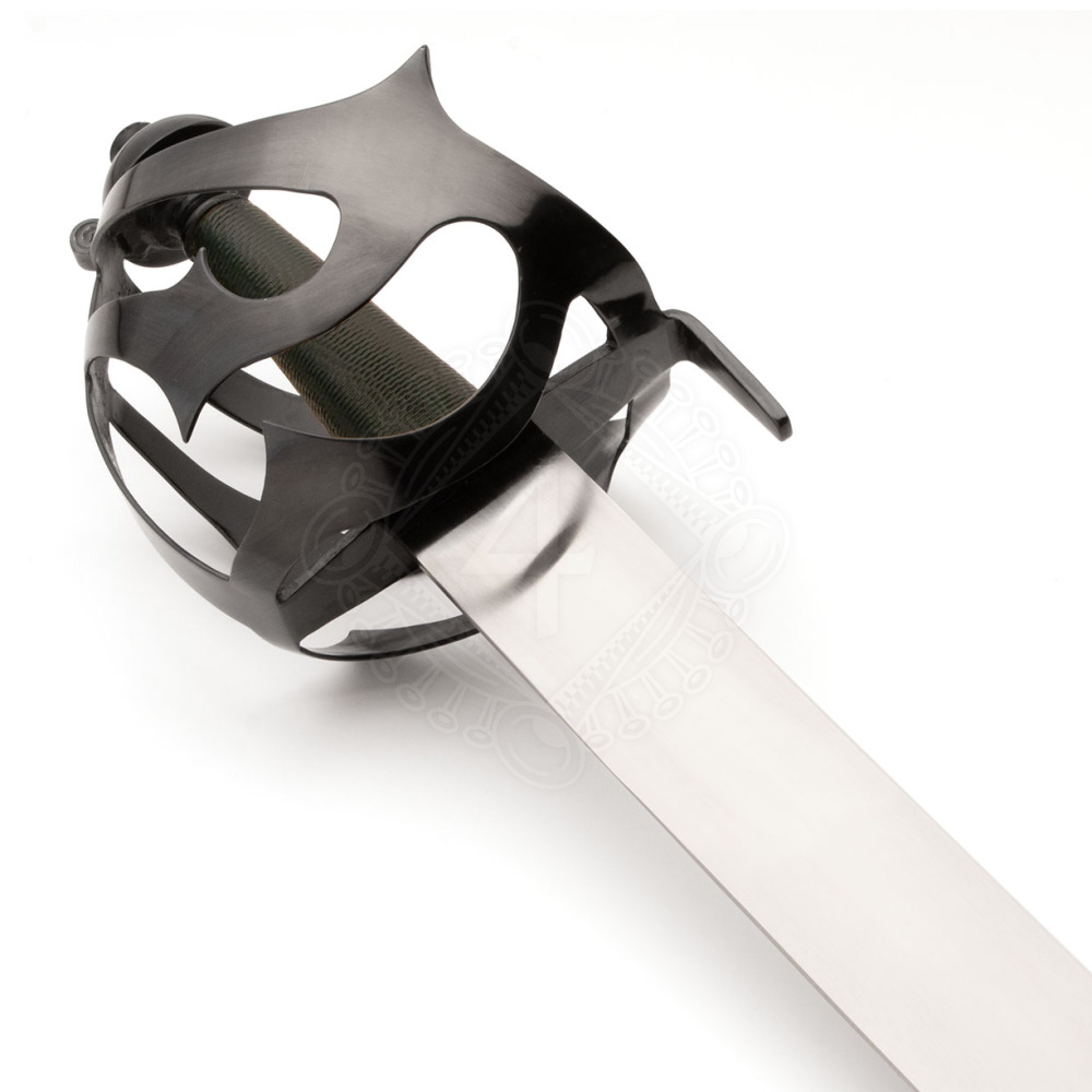 The blade is forged from 1075 high carbon steel, known for its resilience and edge retention. A standout feature is the steel basket hilt with a blackened finish, providing comprehensive hand protection and serving as an "armoured fist" in board-to-board fighting. The scabbard has also been enhanced, now featuring a solid wooden core beneath the premium dark green leather wrap. For an extra touch of pirate flair, the scabbard's chape is adorned with a skull and crossbones medallion, marking you as a true terror of the high seas.
