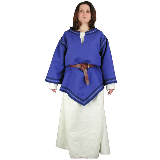 This woman's linen clothing from the 14th century is a combination of lower and upper garment. Petticoat with long tight sleeves is reaching to the ground. Outer clothing is in the form of short bliuad. Bliaud, ladies' clothing 14th century has long funnel-shaped sleeves. On the perimeter, on the sleeves and at neckline is bliaud decorated with a trim. Further product information ...