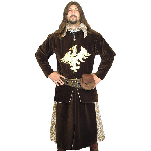 This men's clothing consist of quilted jacket with attached skirt and is reaching below the knees. This is a one-piece dress with long narrow sleeves, elongated tails and lacing at the neck. The breast is decorated with application of an eagle. Skirt has sewn parts that correspond to the collar and cuffs. The front of the coat is quilted and reinforced wadding. Further product information ...