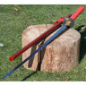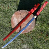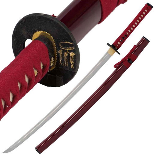 Discover the perfect fusion of martial functionality and artistic design with the John Lee "Nôh" Katana. This stunning samurai sword features a hand-forged 1045 carbon steel blade, complete with an etched hamon line and a weight-reducing fuller (Bo-Hi) for an authentic look and feel. Its most captivating features are the brilliant, high-gloss red scabbard (saya) and a handguard (tsuba) intricately decorated with scenes from traditional Japanese Noh theatre, giving the sword a unique character and profound cultural depth. Further product information ...