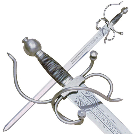 The hilt is cast from Zamak alloy and its surface is finished with silver leaf, giving it a luxurious appearance. The guard features the complex loops and rings typical of the transition period between the medieval arming sword and the rapier. The pommel is spherical, and the grip imitates wire wrapping, ensuring a firm and aesthetic look.