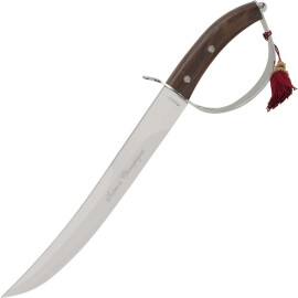 Champagne sabre is a French invention for a stylish opening of bottles of champagne wine. This sabre has a stainless steel blade. Its hand protection is Quality hand cast from brass and the gripp is wooden. The sabre comes with a wooden decorative stand.