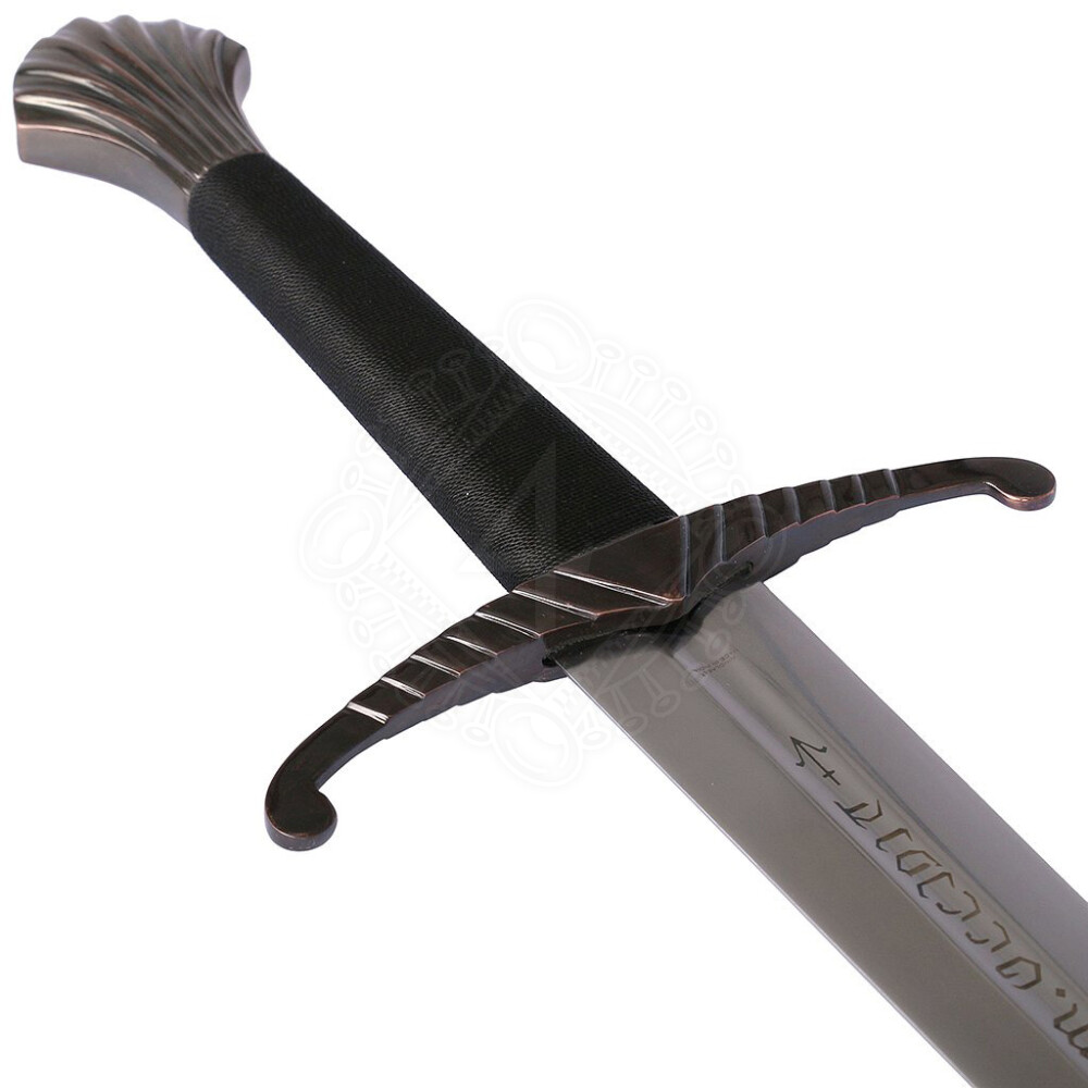 1xThis historical sword features a blade that is made of well-tempered 1065 high carbon steel. Features black cord-wrapped wooden grip and detailed parts with dark bronze finish. A Leather-wrapped scabbard with matching bronze fittings is included. Further product information ...