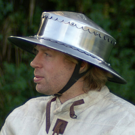 This war hat is proof that protective armour can also be aesthetically refined. Its characteristic feature is the semi-circular cutouts (scalloping) on the steel bands, which are securely riveted to the skull and brim. This detail not only looks superb but also attests to a high level of craftsmanship. The 2 mm material thickness guarantees high durability in combat. The helmet is classified as battle-ready for staged combat; however, please note that it is not certified protective equipment for modern full-contact sports like buhurt.