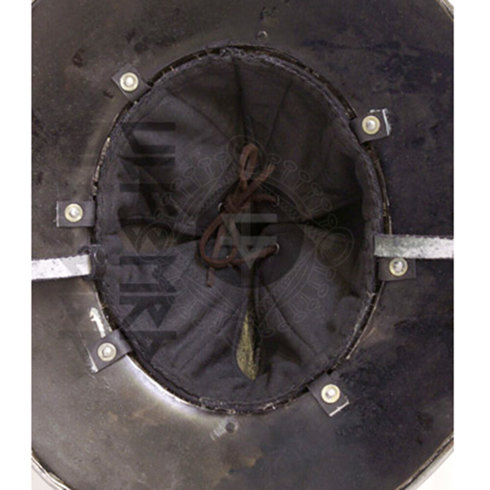 Securely riveted inside the helmet is a high-quality and adjustable padded fabric liner, which effectively absorbs impact and ensures a comfortable fit. A leather cord allows the liner to be easily adjusted to the wearer's head shape. The chin strap is made of cowhide and fitted with a stylish brass buckle. The helmet is produced in two sizes (M and L) to provide ample room for wearing a padded arming cap or a chainmail coif, further enhancing the level of protection and comfort.