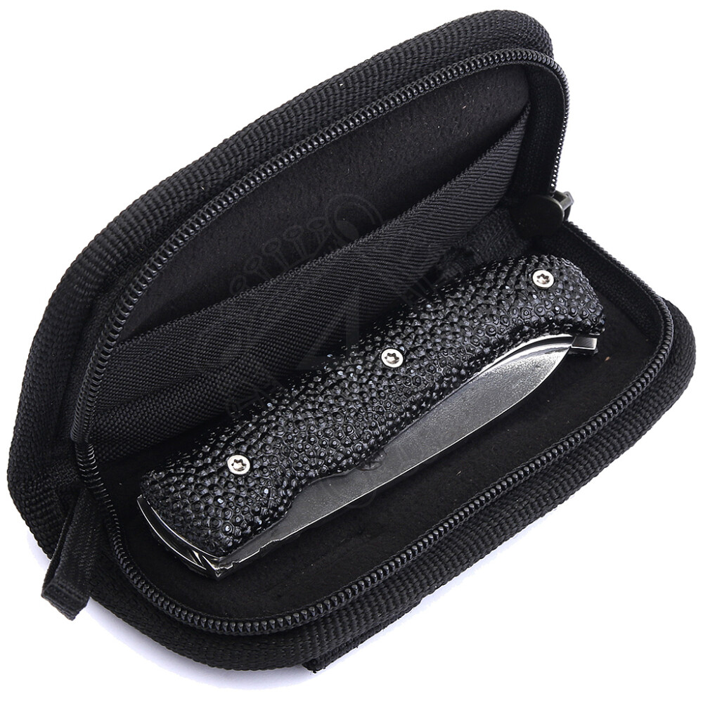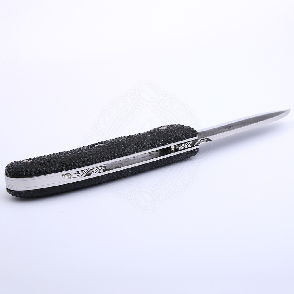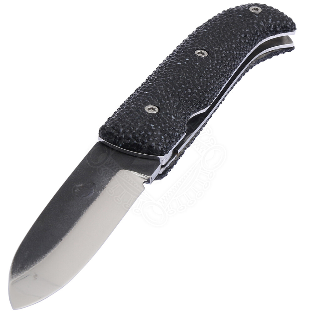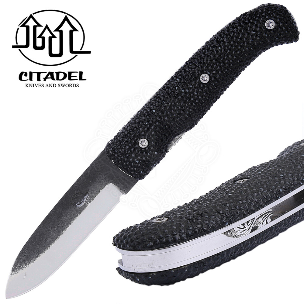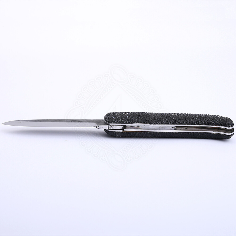 The handle shell is a wooden bowl covered with blackened genuine ray skin. The blade is hand-forged from T508 steel (rust-bearing) with a hardness of approx. 58° Rockwell. The blade is secured via a liner lock. You will receive this knife in a soft case. Further product information ...