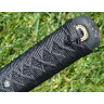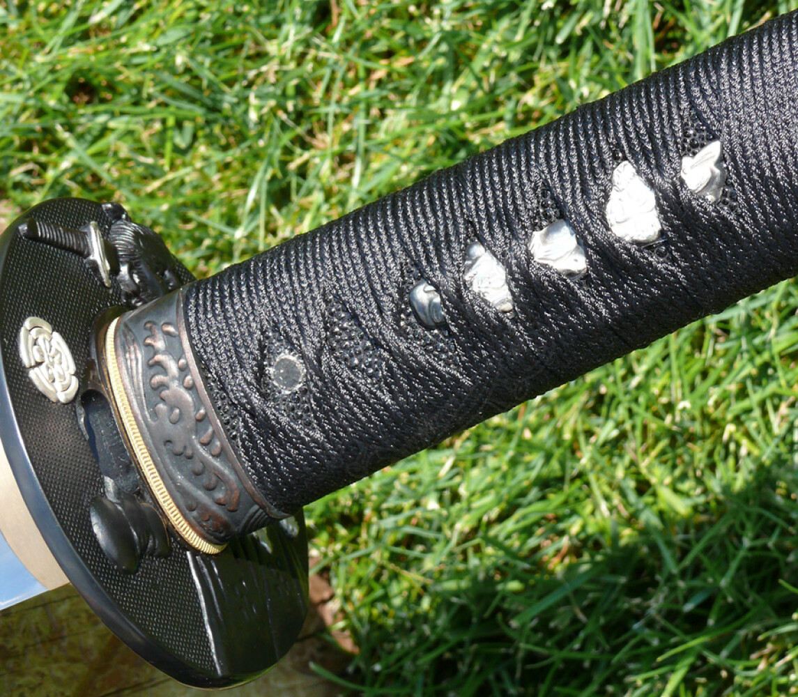 - Handle (Tsuka): The wooden core is covered with genuine, blackened rayskin (Samegawa) and wrapped with black silk in the Katate-Maki (war wrap) style, which is tighter and more functional.
