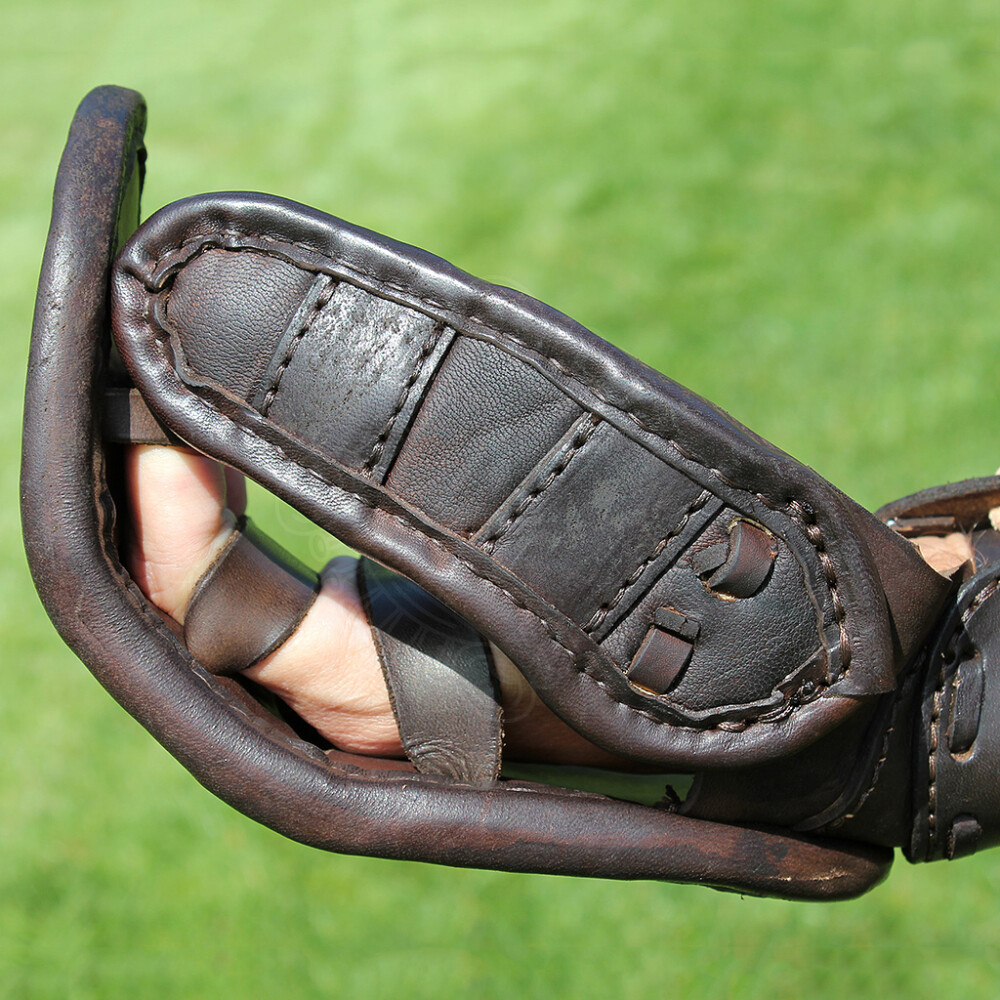 The combat gauntlet with a vambrace was modelled on the specimen from the period of crusades to Palestine. The Leather combat gauntlet with metal fittings on the cuff is formed of the front part that protects fingers against sword hacks. The finger protecting part is circa 1cm thick. The edges of the guard are lined with a leather lining that provide perfect flushing of the edge. The rear part of the gauntlets is made of 3mm thick smooth cowhide. It serves to protect the forearm. Iron forged plates preventing the sword hacking through the guard and other injuries to the forearm are attached to the vambrace with copper rivets. The vambrace is fixed with leather strip. Further product information ...