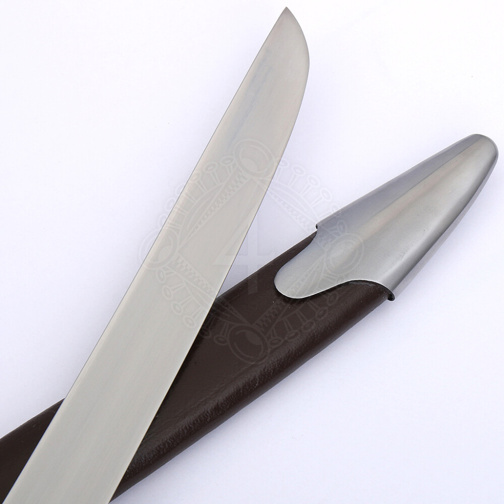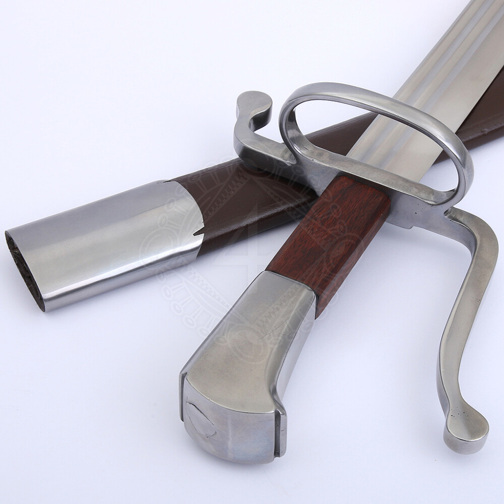 This German hunting sabre is an extremely elegant, finely balanced medieval weapon. It has a short, wooden grip. The comparatively long, riveted pommel and the two short fullers in the single-edged blade deliver its lively feel. The S-shaped cross guard swings up to form a graceful knuckle bow and a side guard ring keeps the hunter's hand firmly on the grip. The German hunting sabre comes with a leather scabbard.