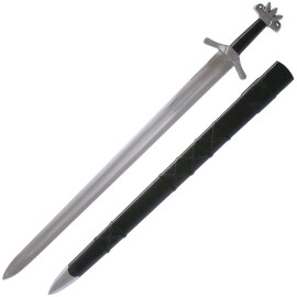 The light, wide fullered Viking style blade is 1095 high carbon, well tempered steel. The scabbard is wood covered in rich harness grade leather with embossing and covered in faux reindeer fur. The beautiful metal parts are applied to the scabbard and the included baldric. Altogether making this entire piece fit for a king.