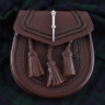 The sporran is a pouch traditionally made of leather or fur. It is worn fastened to a leather belt or a chain in front of the conventionally pocketless kilt and serves as a purse. This leather sporran features three leather tassels and is adorned with Celtic designs. It closes with a pin that is attached to the bag by a chain. Further product information ...