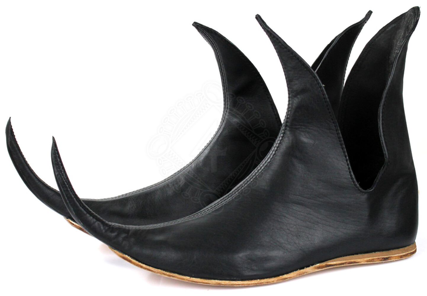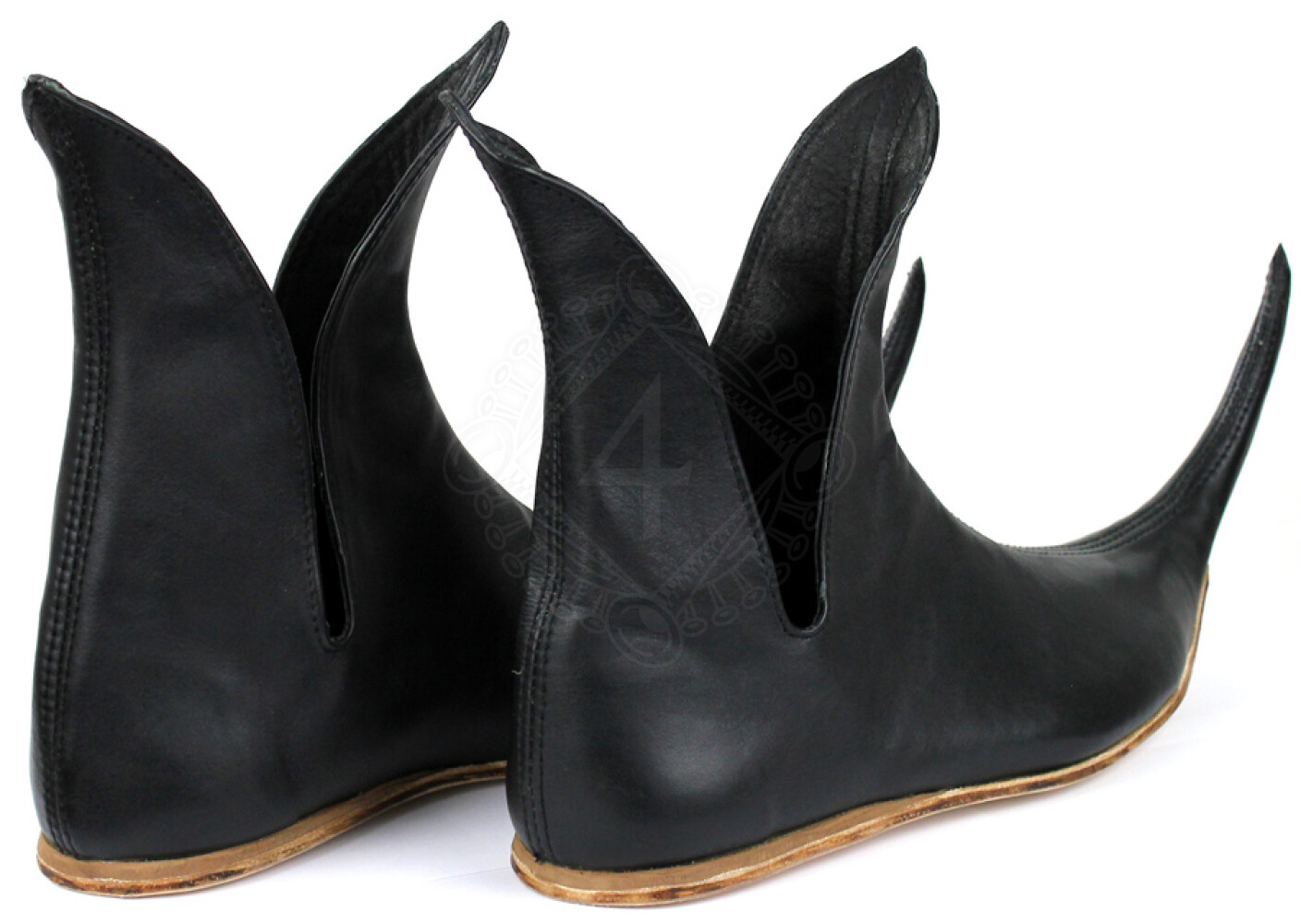 Central Europe was able to avoid the pointed shoe craze almost completely, but the shoes simply overran England and France! After a short period (from around 1370 to 1400), the storm had blown over and nobody wore "poulaines" any longer. But the leather shoes with the long, exaggerated tips experienced a true renaissance starting around 1450: the points grew to around half of the length of the shoe and some were even turned up and connected to the shoe tongue. Even some suits of armor were designed to accommodate these extreme shoes. But today, most people realize that grotesque, long shoe tips that need to be tied to their legs or belts are the stuff of fairy tales. Further product information ...