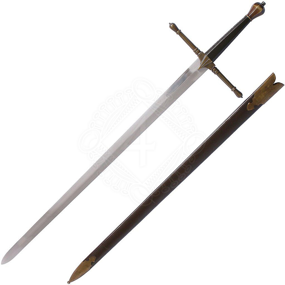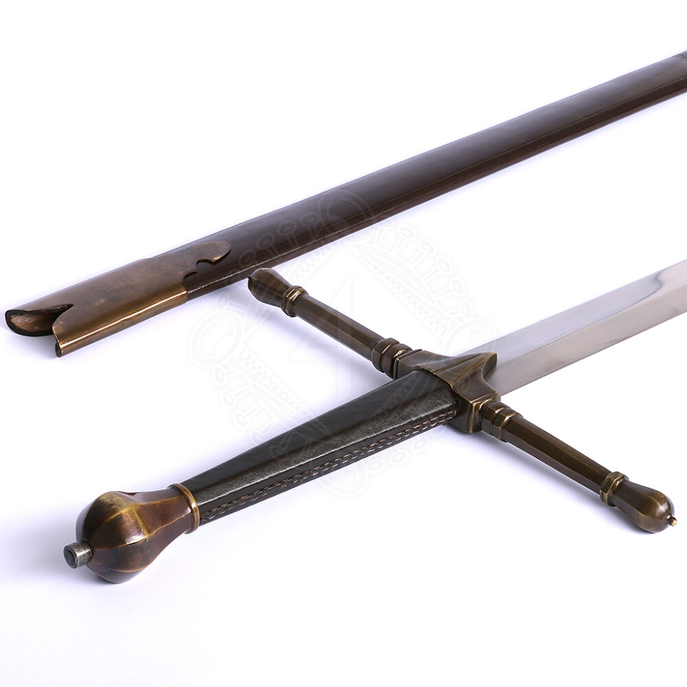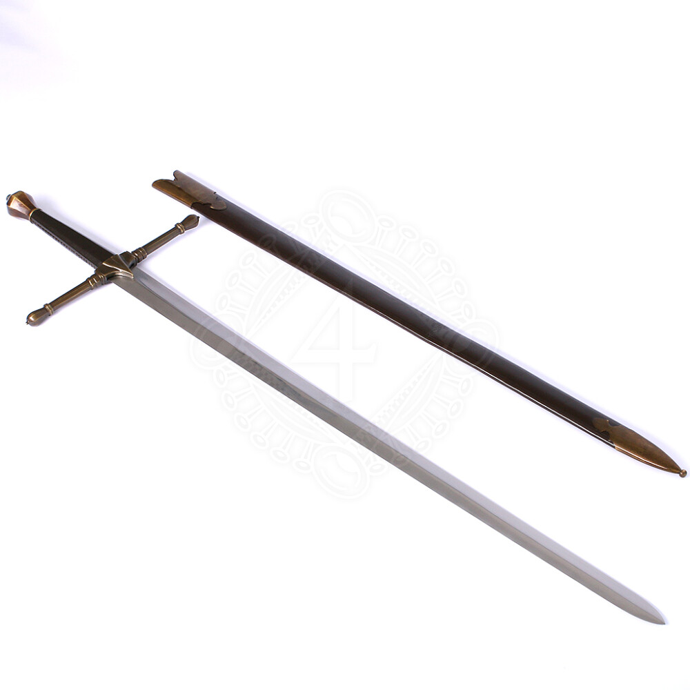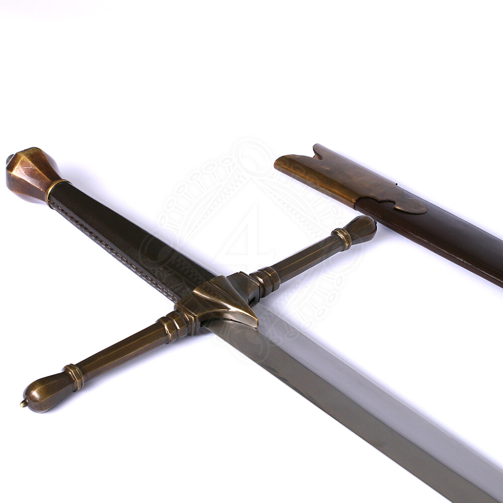 With the increased efficiency of armour, and the consequent abandonment of the shield, two-hand weapons became increasingly popular in battle. The two-hand sword was always a favourite. Not only was it effective in battle, it looked quite impressive. This version is a noble sword, and it looks the part. Brass was also quite popular, and so the guard and the pommel are made of brass and have antiqued finish so that it looks like a well-used battle sword that any warrior worth his salt would be proud to carry. The grip is wood, covered with brown leather. The scabbard is brown leather with antiqued furniture. Further product information ...