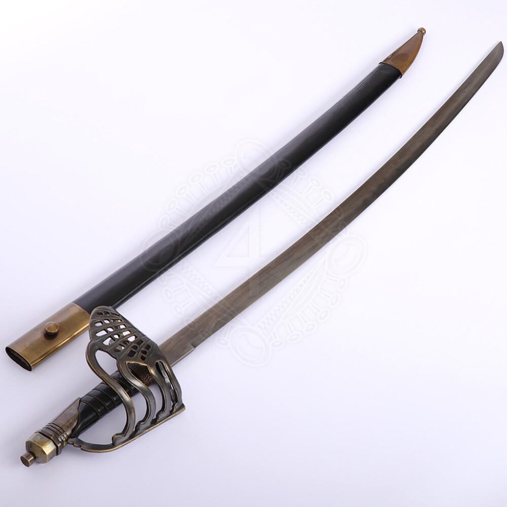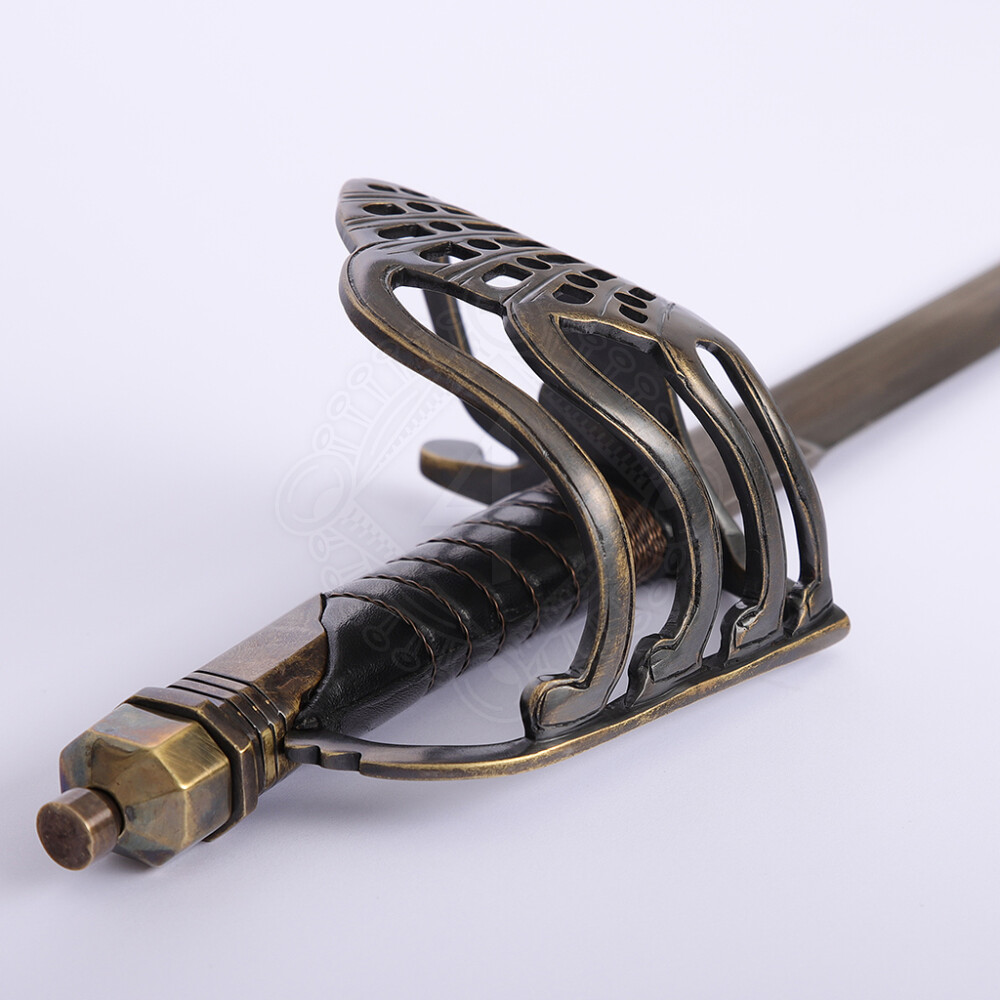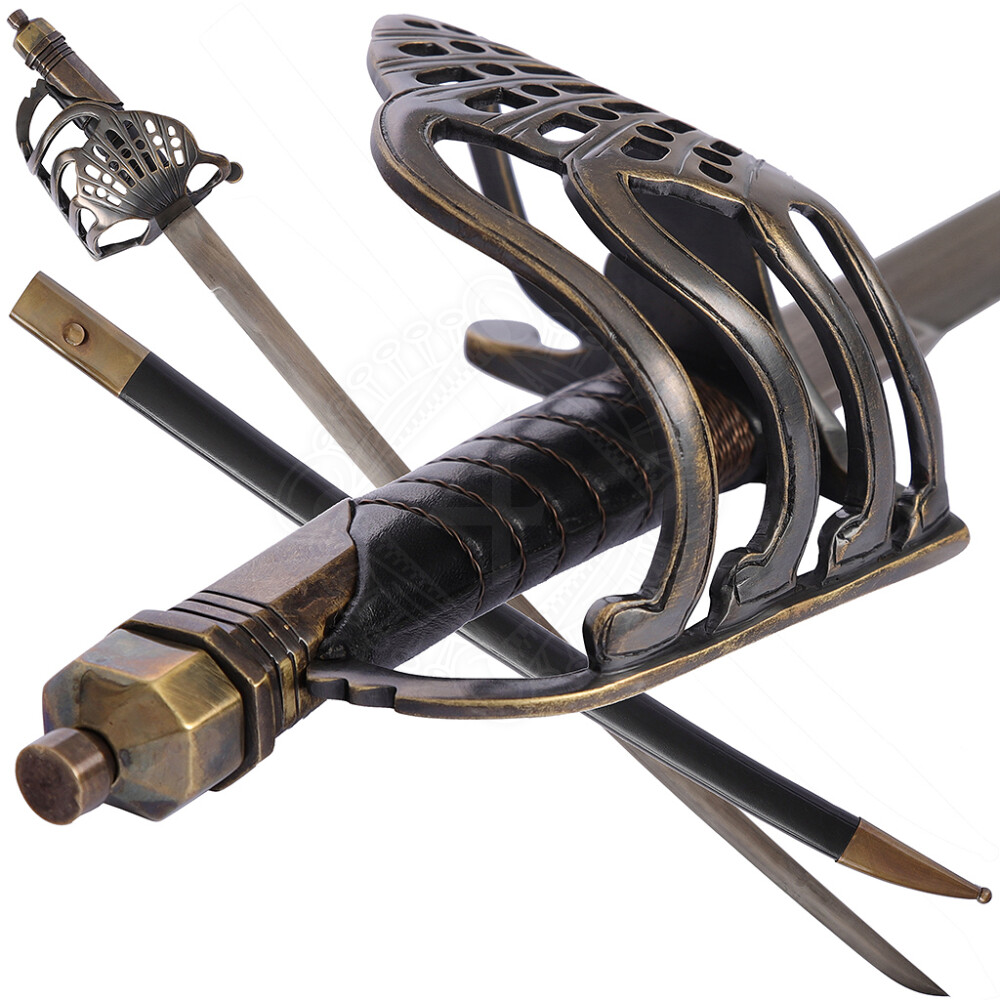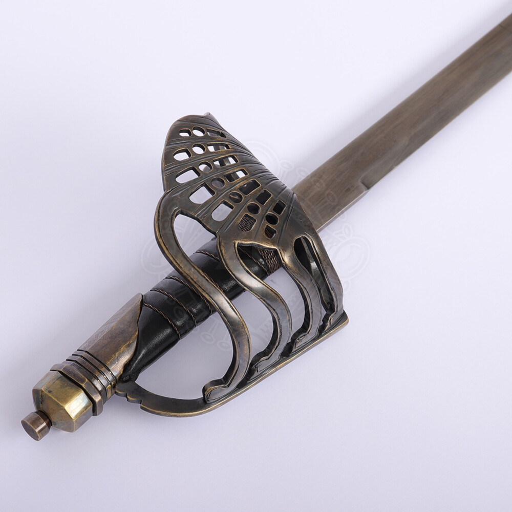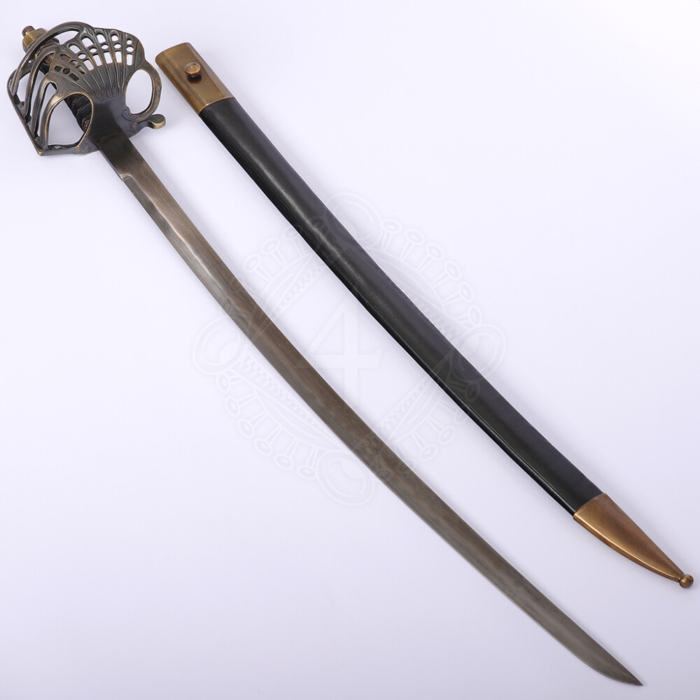 This unique cutlass was truly meant for a pirate captain. The tough blade is made of high-carbon steel, while the entire sword has been given an antiqued finish. The guard has a pierced, seashell inspired design, which adds both beauty and protection. The handle is wood, wrapped with soft black leather and finished with a matching chain. Further product information ...