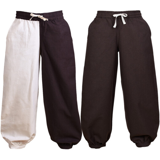 These loose-fitting cotton trousers are divided vertically in two colours. So-called parti-coloured (or Mi-Parti) garments were quite popular in the Middle Ages. Cuffs on the hems give the trousers their voluminous fit. The waistband is elasticated and equipped with an adjustable tie cord to allow for a perfect fit. The pants also feature side pockets. Further product information ...