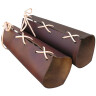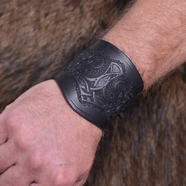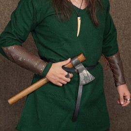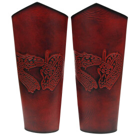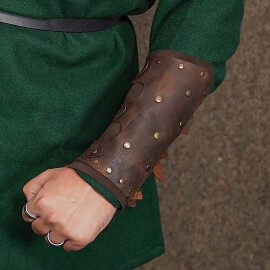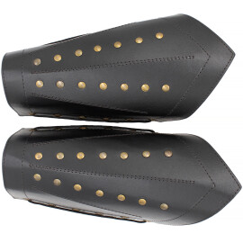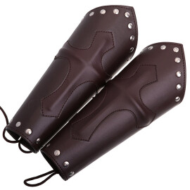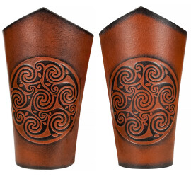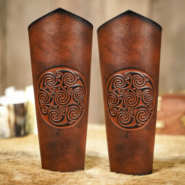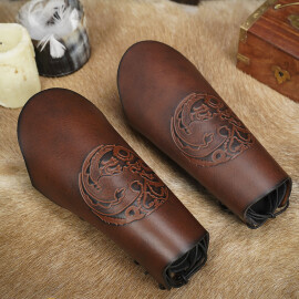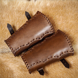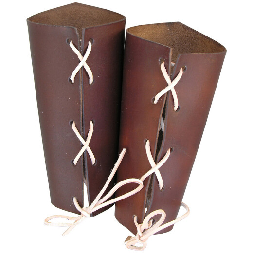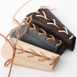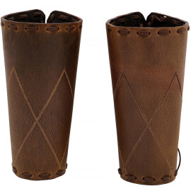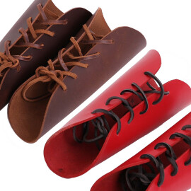 These simple guards protecting the forearm are made of up to 3.5mm thick smooth cowhide. The leather bracers are drawn tight with a leather rope. The bracer's length is 18.5cm. Besides the colour shown in the picture the bracers are available in other colours: see the choice of colour. Further product information ...