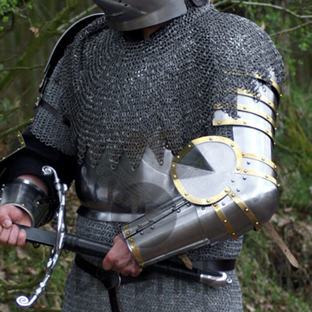 Wearable and flexible replica of a late medieval arm harness, also called brassard, consisting of steel upper arm tubes, couters and lower arm tile tubes. The arms can be adjusted by means of three internally mounted leather straps. The shoulder part of the arm harness has been created to either fit the Gambeson or it can be connected to other plate armour, eg. gorgets or breastplates. Further product information ...