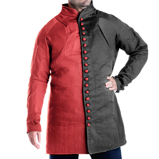 Well finished and very high quality gambeson. Features 'soft' cloth buttons which are more comfortable under mail than wooden buttons. Lightly padded. Almost tailored fit. Rather stiff to begin with but gets better as you use it - a bit like new shoes.
