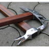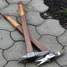 This war hammer was intended for close combat action. It consists of a handle and a steel head. War hammers were developed as a consequence of the ever more prevalent surface-oil-quenched steel surfacing of wrought iron armors of the late medieval battlefields during the fourteenth and fifteenth centuries. The surface of the armour was now as hard as the edge of a blade, so a blade tended to ricochet. Swords, or the blade of a battleaxe, were likely only to give a glancing blow, losing much of the impact, especially on the high curvature of the helmet. The war hammer could deliver the full force to the target. Made after pictures in Müller/Kölling/Platow – Europäische Hieb and Stichwaffen.